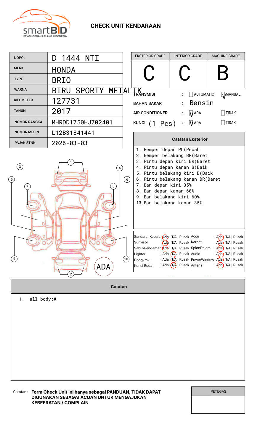 KM SALAH KETIK ( SESUAI ORDO YG BENAR ADALAH : 127731 )//SEBELUM MELAKUKAN PENAWARAN UNIT PESERTA LELANG WAJIB MELAKUKAN PENGECEKAN UNIT DAN DOKUMEN TERLEBIH DAHULU // PIC DENNY : 0852-9442-5362 // UNIT DIKENAKAN BIAYA PPN 1.1% DARI HARGA TERBENTUK // FAKTUR BERUPA FOTOCOPY