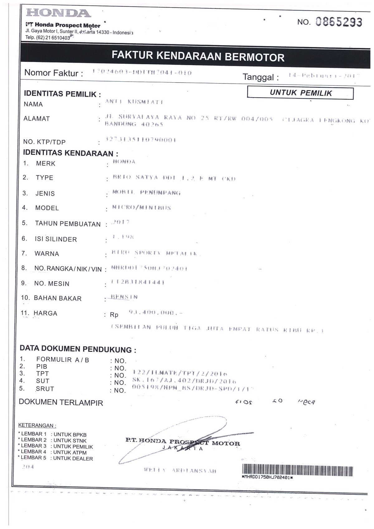 | No. Rangka | : | MHRDD1750HJ702401 |