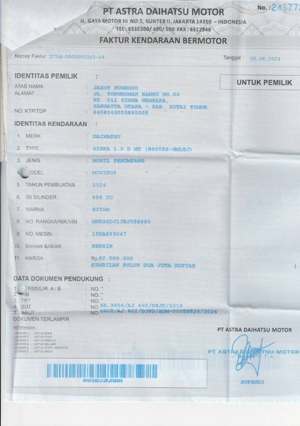 | No. Polisi | : | KT 1776 SO |