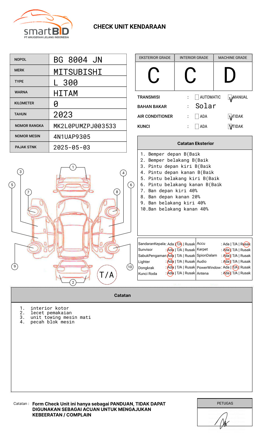 SEBELUM MELAKUKAN PENAWARAN HARAP CEK KONDISI UNIT SERTA DOKUMEN TERLEBIH DAHULU//UNIT DIKENAKAN BIAYA PPN 1,1% DARI HARGA TERBENTUK//PEMENANG LELANG DIKENAKAN BIAYA MOBILISASI RP.1.000.000//PIC CHANDRA +62 813-6662-6995 / DEDDY 082280573391