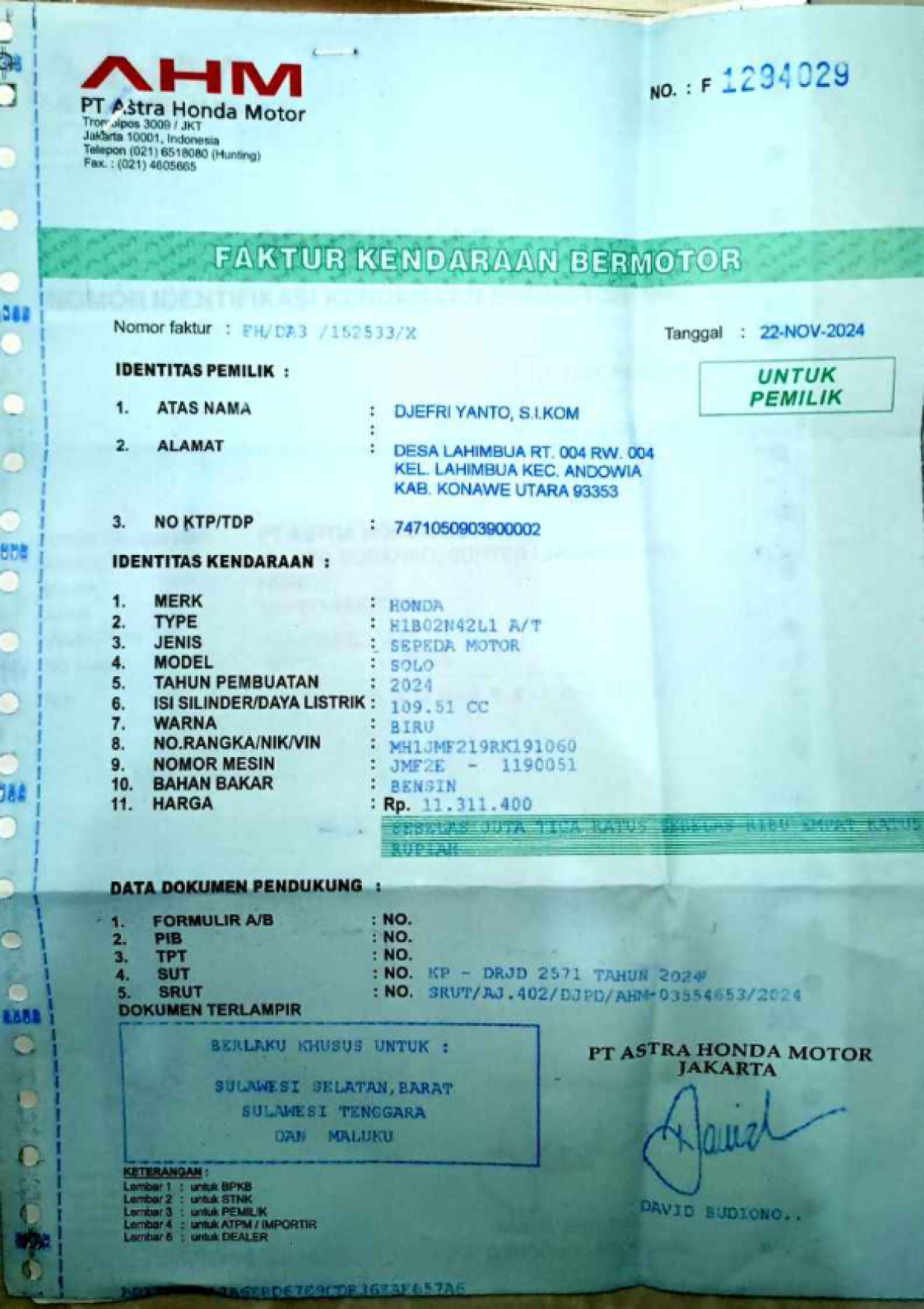 | No. Rangka | : | MH1JMF219RK191060 |