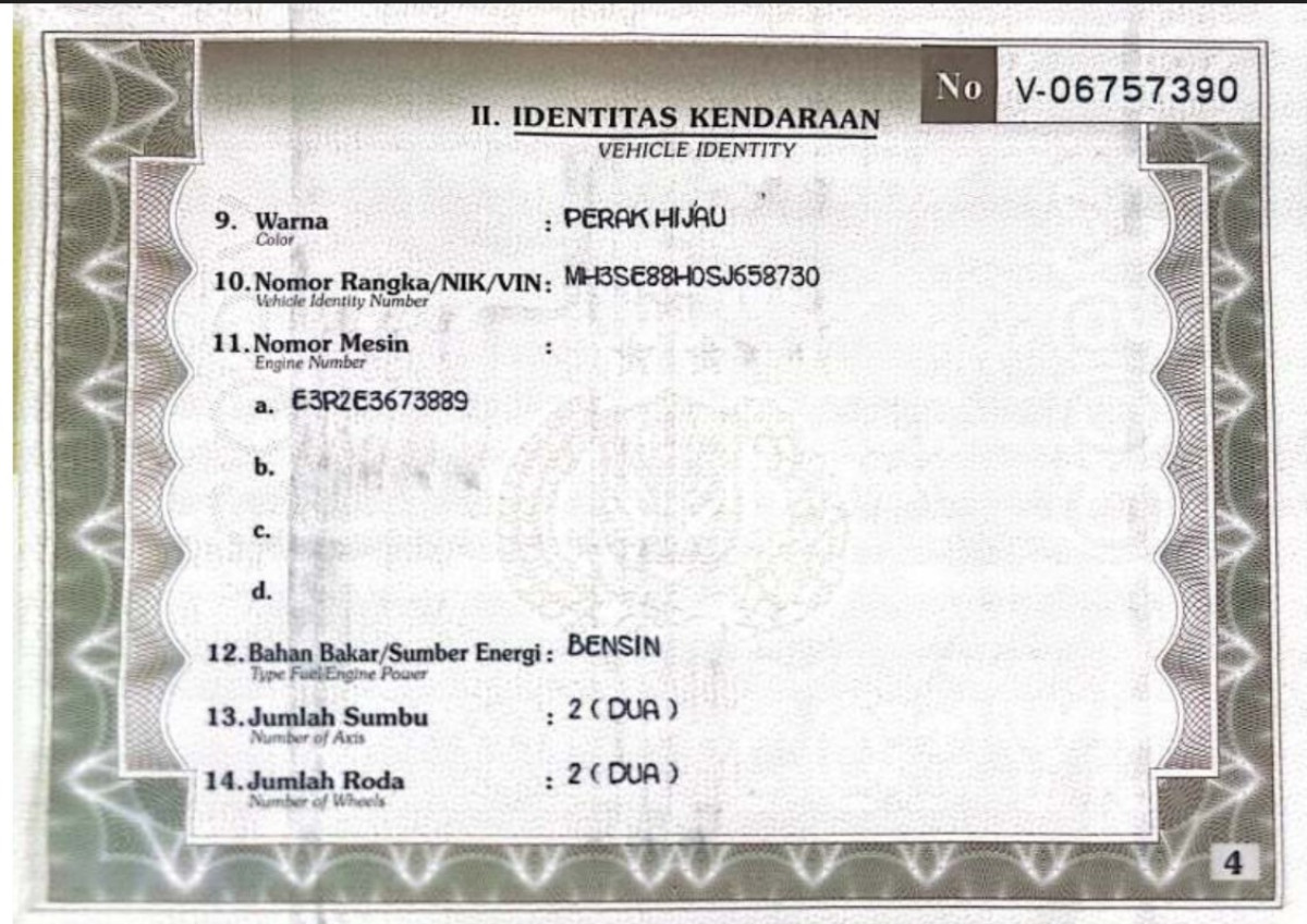 | No. Rangka | : | MH3SE88H0SJ658730 |