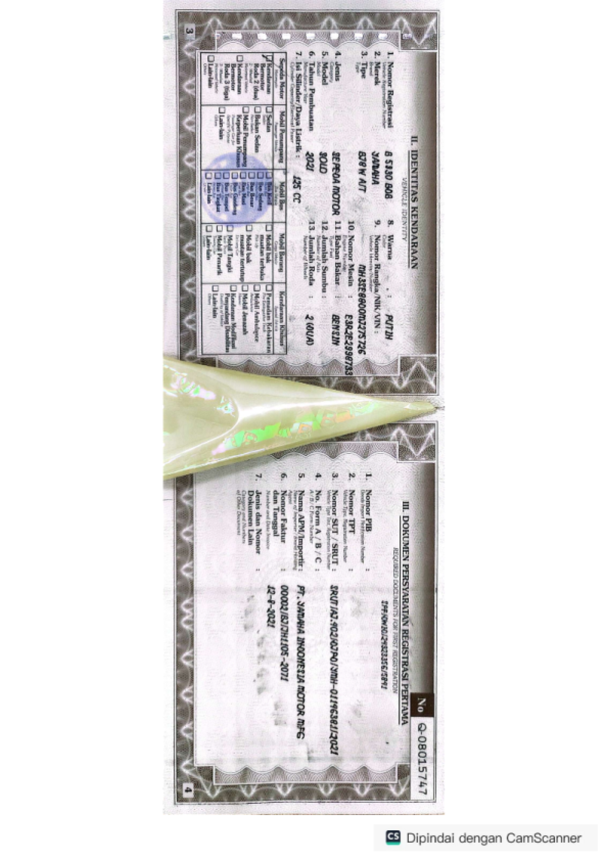 | No. Rangka | : | MH3SE88DOMJ275726 |