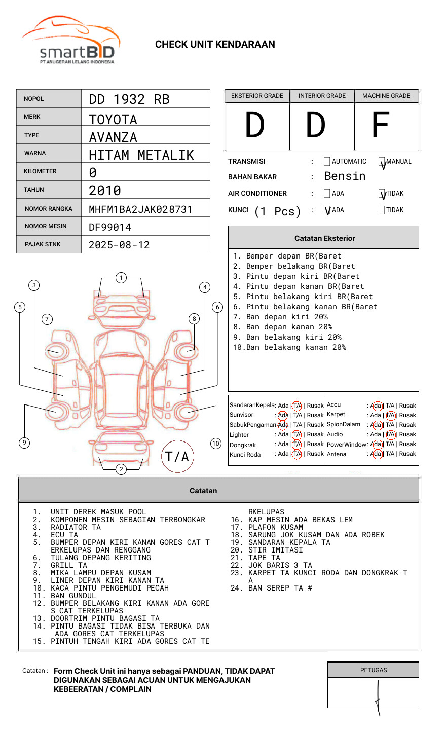 SEBELUM MELAKUKAN PENAWARAN UNIT PESERTA LELANG WAJIB MELAKUKAN PENGECEKAN UNIT DAN DOKUMEN TERLEBIH DAHULU // PIC RUDAL 0821 9140 0425 / MUHAMMAD DARWIS 082348587430 // UNIT DIKENAKAN BIAYA PPN 1.1% DARI HARGA TERBENTUK // ADA PERBEDAAN WARNA PADA FISIK PUTIH PADA BPKB HITAM METALIK // TIDAK ADA KET. RUBAH WARNA PADA BPKB
