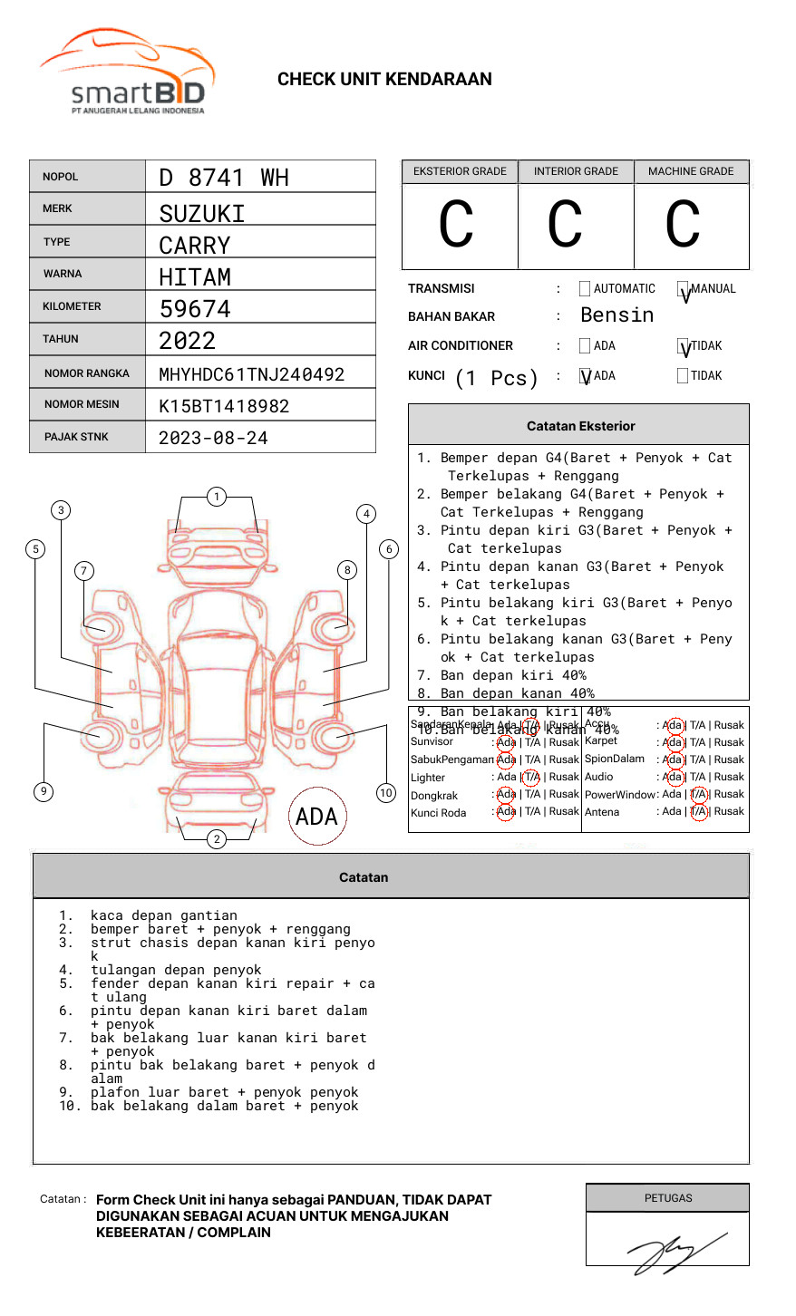 SEBELUM MELAKUKAN PENAWARAN UNIT PESERTA LELANG WAJIB MELAKUKAN PENGECEKAN KESESUAIAN UNIT DAN DOKUMEN UNIT/ PEMENANG LELANG DIKENAKAN BIAYA PPN 1,1% DARI HARGA TERBENTUK//BIAYA ROYA FIDUCIA SEBESAR 100.000 DITANGGUNG PEMENANG // PIC AWAL +62 895-3231-57272 / ANDRI 085136886212