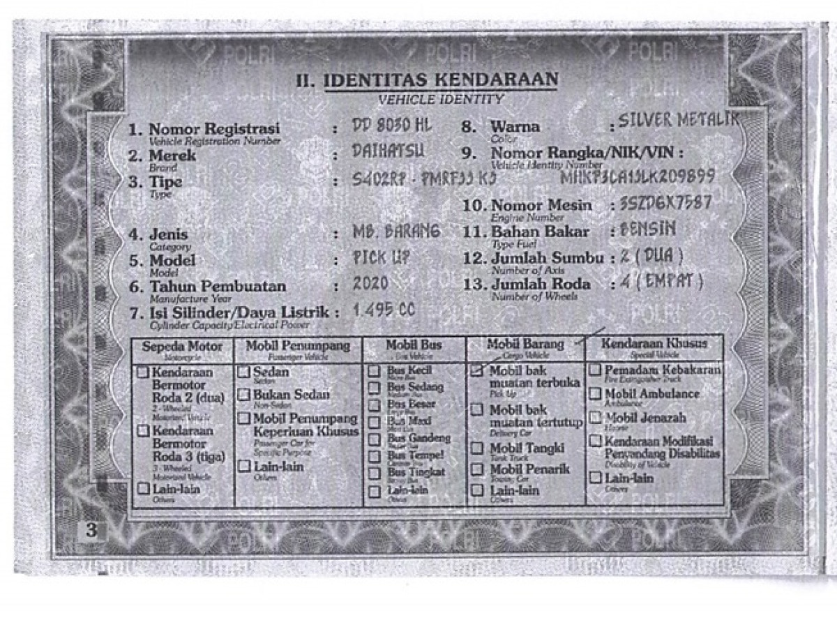Mesin berfungsi, Body tergores, Accu suak, Ban cadangan tidak ada, Setir imitasi, Alat mobil tidak ada, Lantai bak baret//Spring (FR) | Spring (RR) | Gasket Cylinder Head | Air Filter | Tire (Rr-R) | Tire (Fr-L) | Tire (Fr-R) | Tire (spare) | Brake Master | Fan Belt | Rim (spare) | Tire (Rr-L) | Engine Services (Light) | Aircon Evaporator | Clutch Plate | Brake Pad (Fr) | Injector | Brake Pad (Rr) | Spark Plug(s) | Battery/sunvisor (L) | Interior Saloon | Bolt Crane and Jack | Steering-wheel | Tool Kit/Rim cover (Rr-R) | Rim cover (Rr-L) | Rim cover (Fr-L) | Turn Lamp (Fr-L) | Turn Lamp (Rr-R) | Headlight (Fr-L) | Turn Lamp (Rr-L) | Rim cover (Fr-R) | Side Skirt Repair (L) | Cargo Panel Repair (Deck) | Windshield Wiper | Taillight (Rr-R) | Taillight (Rr-L) | Side Skirt Repair (R) | Fender Repair (Fr-L) | Fender Repair (Fr-R) | Bumper Repair (Fr)// UNIT TIDAK DILAKUKAN PENGECEKAN OLEH TIM SMARTBID// SEBELUM MELAKUKAN PENAWARAN HARAP CEK KONDISI UNIT DAN DOKUMEN TERLEBIH DAHULU// WAJIB MENGHUBUNGI PIC DAN DATANG KE LOKASI UNTUK PENGECEKAN UNIT// UNIT DILELANG APA ADANYA PERMASALAHAN YANG TIMBUL DILUAR TANGGUNG JAWAB SMARTBID// PENGAMBILAN UNIT SLIDE H+2 DARI PELUNASAN // JIKA INGIN MENGAMBIL UNIT HARAP UNTUK KONFIRMASI DAHULU KE SMARTBID // JIKA YANG MENGAMBIL BIDDER HARAP MEMBAWA KTP ASLI // JIKA PENGAMBILAN DIWAKILKAN WAJIB MEMBAWA SURAT KUASA ASLI // UNIT DIKENAKAN BIAYA PPN 1,1% DARI HARGA TERBENTUK// LOKASI UNIT HUBUNGI CS PUSAT 081188089292//