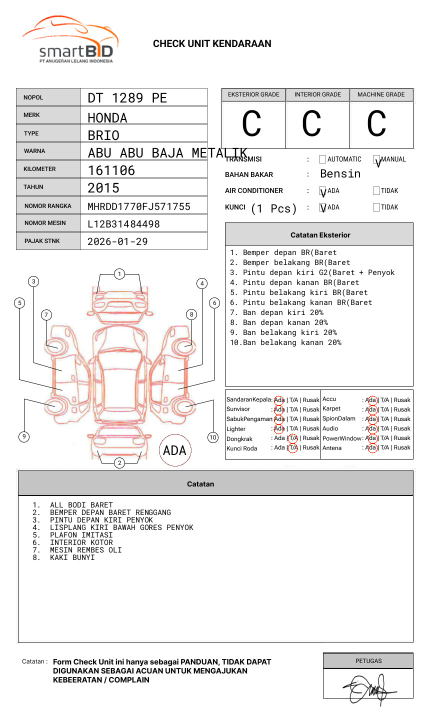 SEBELUM MELAKUKAN PENAWARAN UNIT PESERTA LELANG WAJIB MELAKUKAN PENGECEKAN UNIT DAN DOKUMEN TERLEBIH DAHULU // PIC AHMAD 082345278181 IKRAM 085241587738 // UNIT DIKENAKAN BIAYA PPN 1.1% DARI HARGA TERBENTUK //