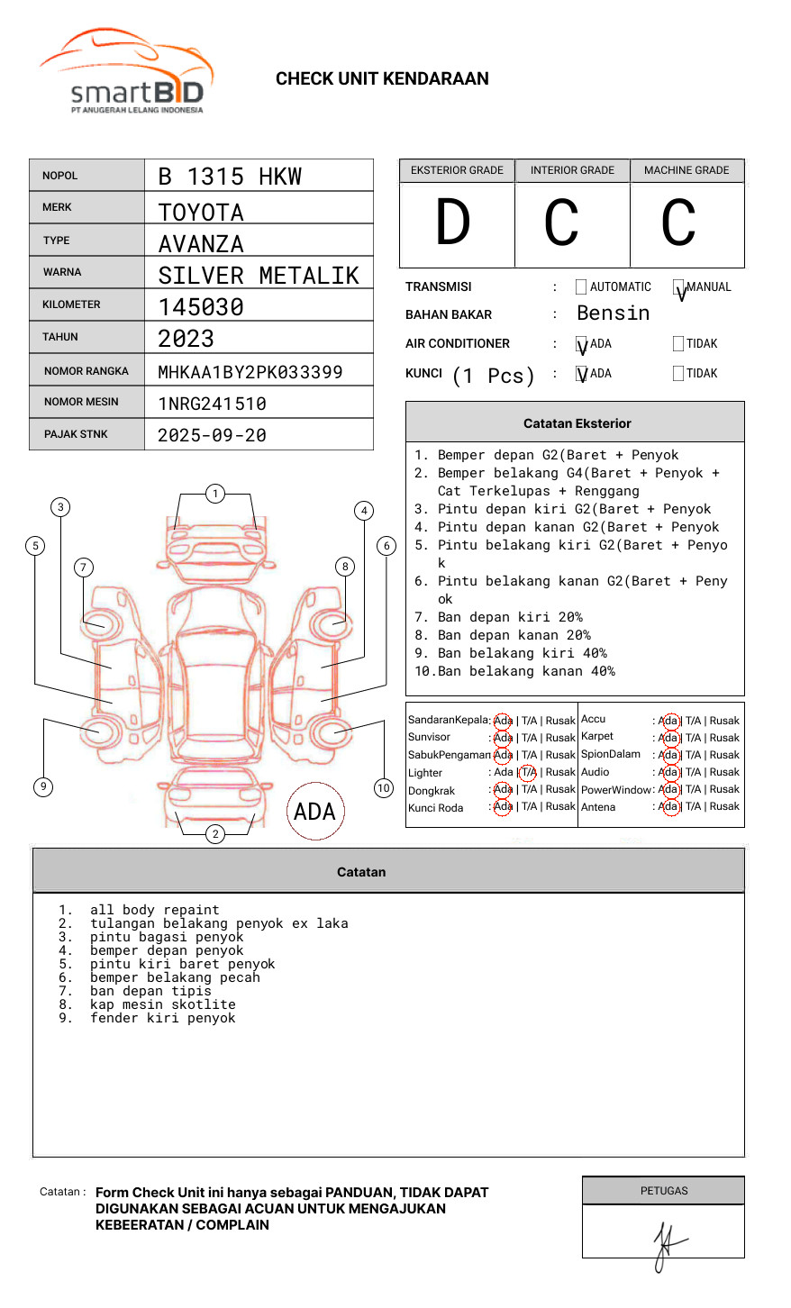 SEBELUM MELAKUKAN PENAWARAN UNIT PESERTA LELANG WAJIB MELAKUKAN PENGECEKAN UNIT DAN DOKUMEN TERLEBIH DAHULU //WANDA :62 858-6767-0166 // UNIT DIKENAKAN BIAYA PPN 1.1% DARI HARGA TERBENTUK // UNIT DIKENAKAN BIAYA ROYA FIDUSIA 100.000