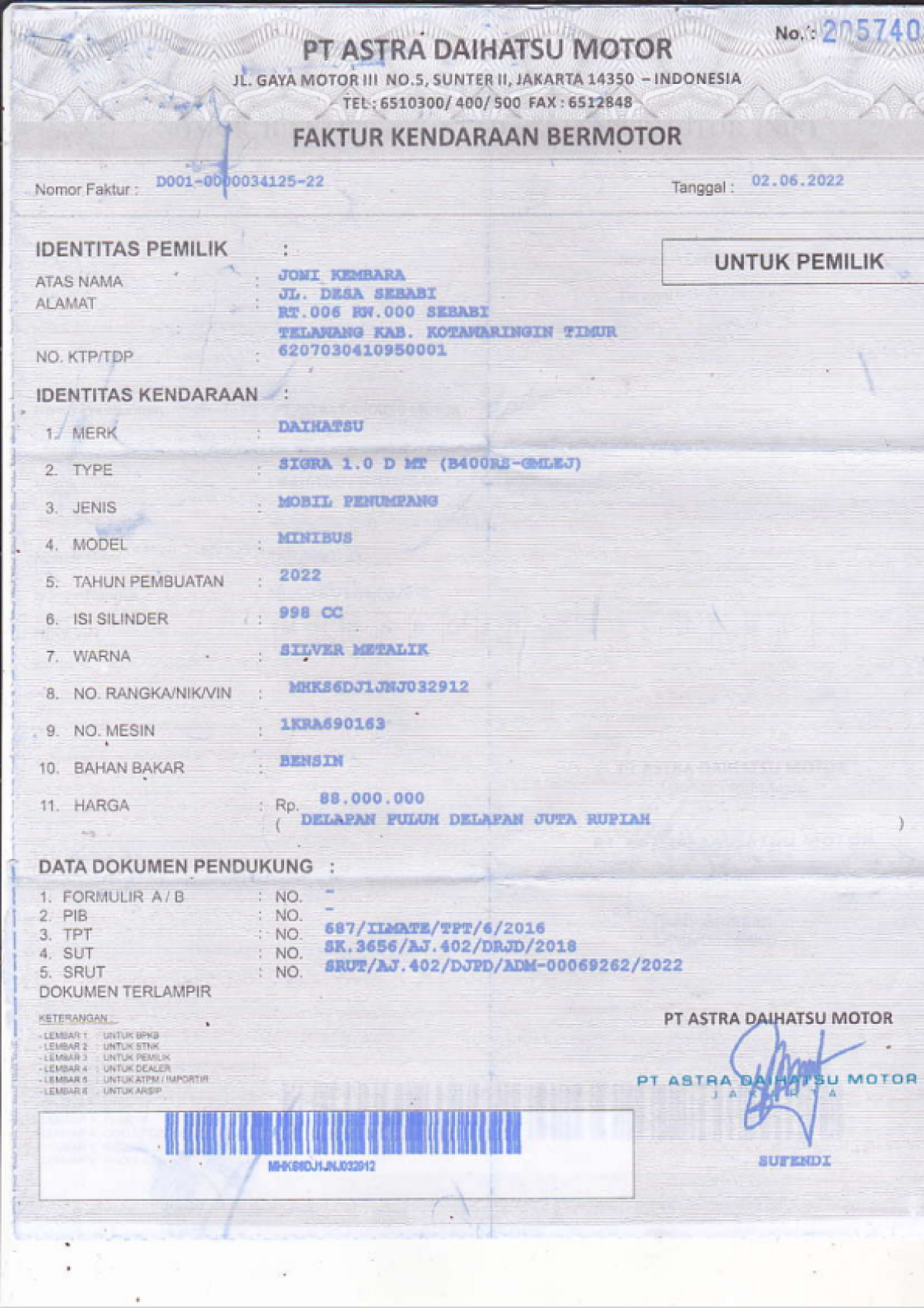 | No. Rangka | : | MHKS6DJ1JNJ032912 |