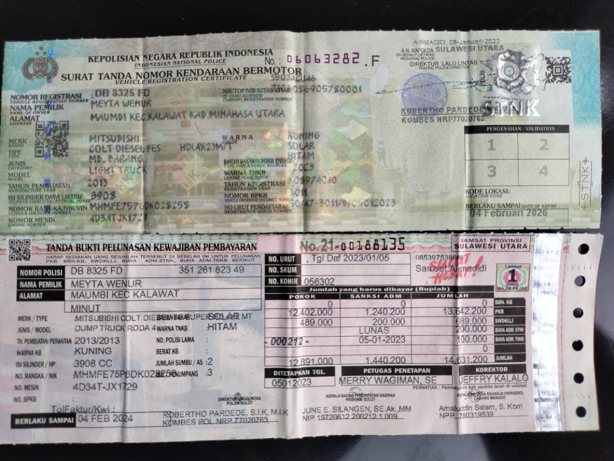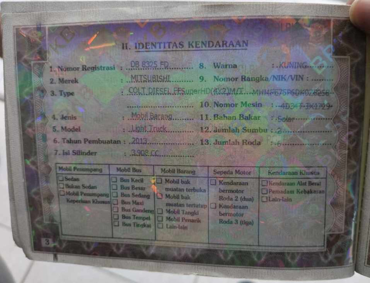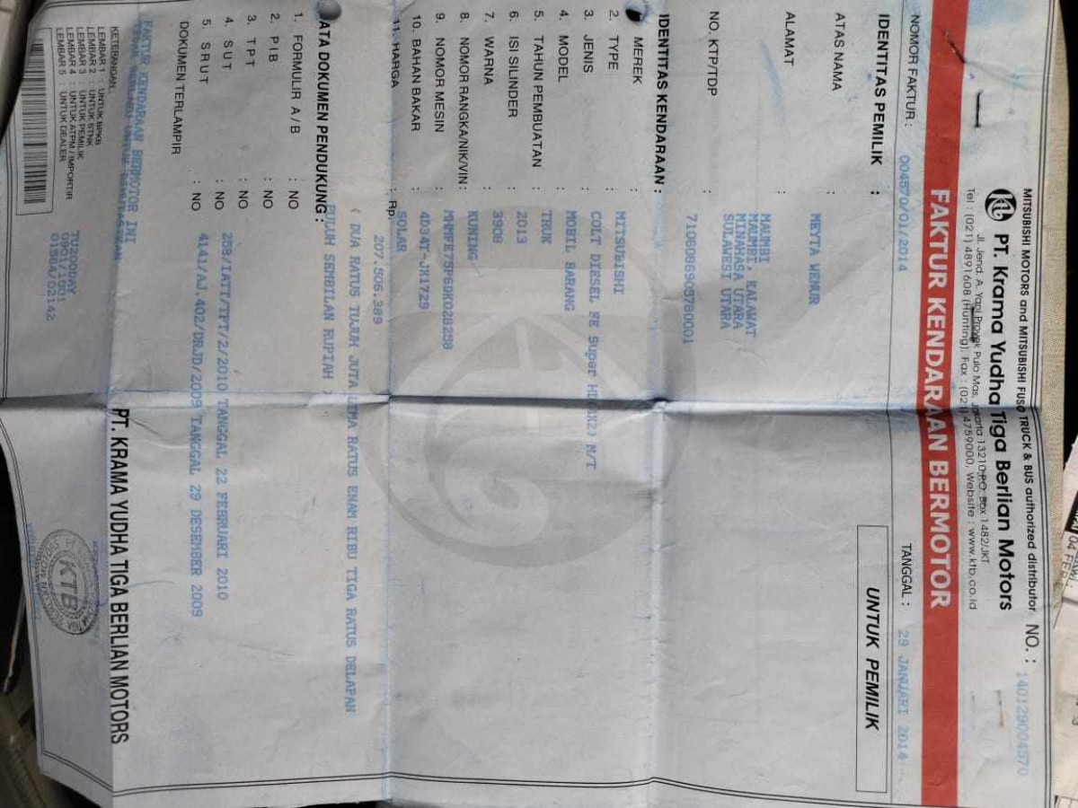 NOPOL FISIK T/A // UNIT TIDAK DILAKUKAN PENGECEKAN OLEH TIM SMARTBID// SEBELUM MELAKUKAN PENAWARAN HARAP CEK KONDISI UNIT DAN DOKUMEN TERLEBIH DAHULU// WAJIB MENGHUBUNGI PIC DAN DATANG KE LOKASI UNTUK PENGECEKAN UNIT// UNIT DILELANG APA ADANYA PERMASALAHAN YANG TIMBUL DILUAR TANGGUNG JAWAB SMARTBID// PENGAMBILAN UNIT SLIDE H+2 DARI PELUNASAN // JIKA INGIN MENGAMBIL UNIT HARAP UNTUK KONFIRMASI DAHULU KE SMARTBID // JIKA YANG MENGAMBIL BIDDER HARAP MEMBAWA KTP ASLI // JIKA PENGAMBILAN DIWAKILKAN WAJIB MEMBAWA SURAT KUASA ASLI // UNIT DIKENAKAN BIAYA PPN 1,1% DARI HARGA TERBENTUK// LOKASI UNIT HUBUNGI Bpk. Hairil / Bpk.Angga 0853-4005-1775 / 0858--2380-8820 / CS PUSAT 081188089292// Unit mati, mesin rusak, kabin baret penyok keropos, cat kusam, spion rusak, bak penyok keropos, ban gundul, lampu kusam, grill t/a, fender t/a, unit nopol manado, interior kotor, karpet variasi, dashboard repaint, chasis karat.//Fan Belt | Tire (spare) | Shocbreakers (Rr) | Dynamo Starter | Spring (FR) | Spring (RR) | Rim (Rr-L) in | Tire (Rr-R) in | Fuel Pump | Tire (Rr-L) out | Wheel Bearing (Fr) | Spark Plug(s) | Gasket Cover Head | Air Filter | Clutch Plate | Header | Tire (Rr-R) out | Rim (Rr-R) in | Gasket Cylinder Head | Tire (Fr-R) | Rim (Fr-R) | Tire (Fr-L) | Dinamo Starter | Rim (Rr-L) out | Rim (Fr-L) | Coil Ignition | Rim (Rr-R) out | Rim (spare) | Chassis | Radiator | Rack Steer | Brake Pad (Fr) | Tire (Rr-L) in | Wheel Bearing (Rr) | Battery | Disc Pad | Shocbreakers (Fr) | Brake Pad (Rr) | Muffler | Radiator Fan | Engine Services (Heavy) | Engine Mounting | Brake Master/Head Unit | Tool Kit | Bolt Crane and Jack | Ceiling Trim | Dashboard | Interior Saloon/Grilles | Turn Lamp (Rr-L) | Turn Lamp (Rr-R) | Taillight (Rr-R) | Cargo Panel Repair (Rr) | Headlight (Fr-R) | Front panel repair | Electric Mirror (R) | Door Repair (Fr-L) | Door Repair (Fr-R) | Cargo Panel Repair (Deck) | Turn Lamp (Fr-L) | Taillight (Rr-L) | Roof Repair | Turn Lamp (Fr-R) | Bumper Repair (Fr)