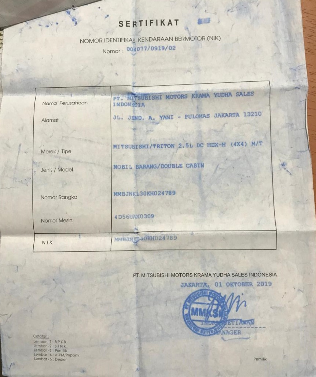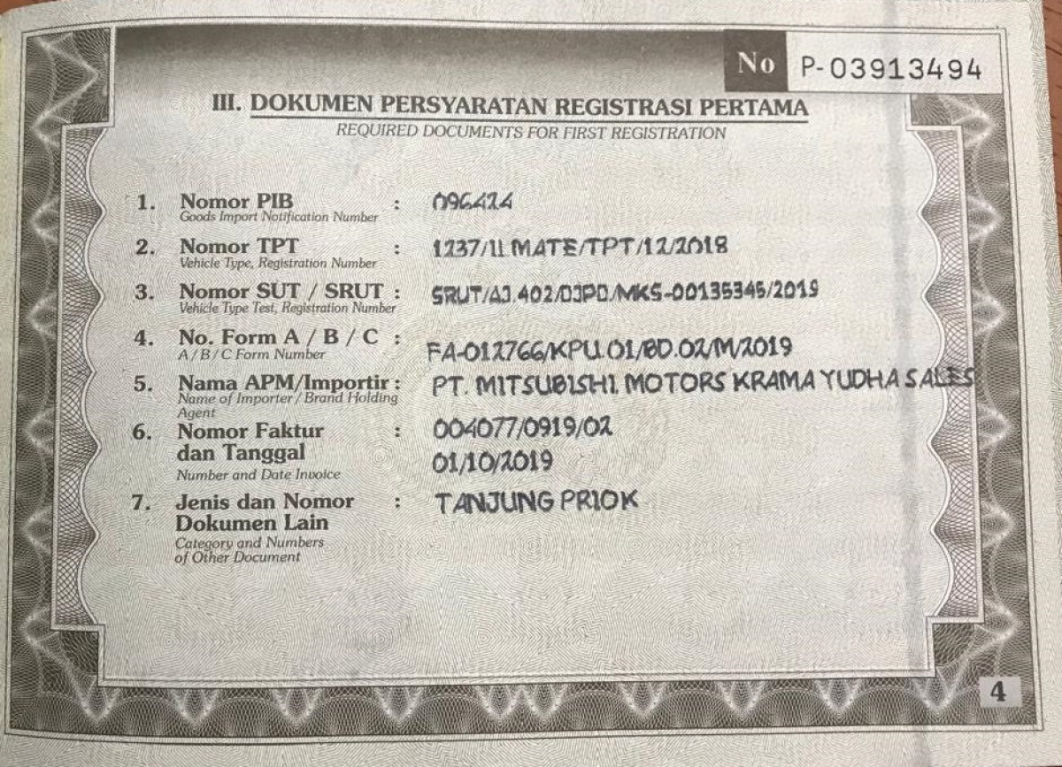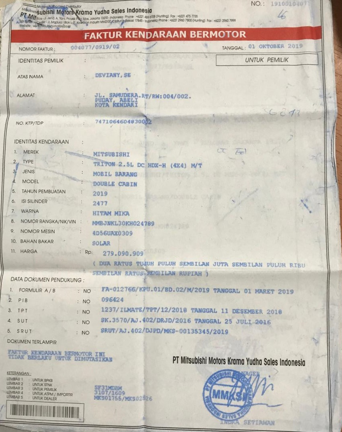 | No. Rangka | : | MMBJNKL30KH024789 |