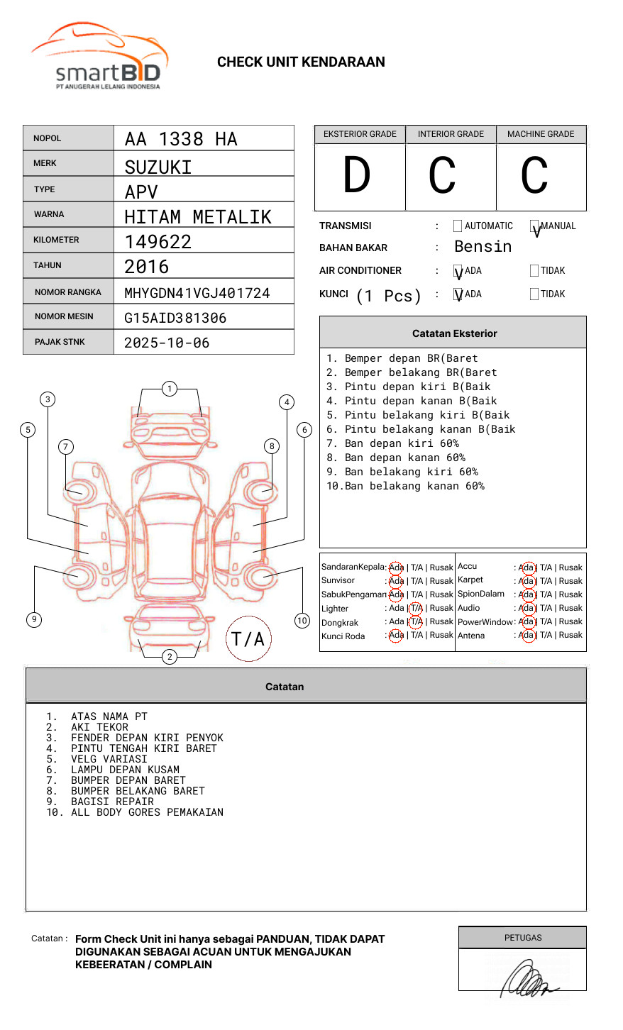 SEBELUM MELAKUKAN PENAWARAN UNIT PESERTA LELANG WAJIB MELAKUKAN PENGECEKAN UNIT DAN DOKUMEN TERLEBIH DAHULU // PIC TIAN : +62 896-6265-5959 // UNIT DIKENAKAN BIAYA PPN 1.1% DARI HARGA TERBENTUK //