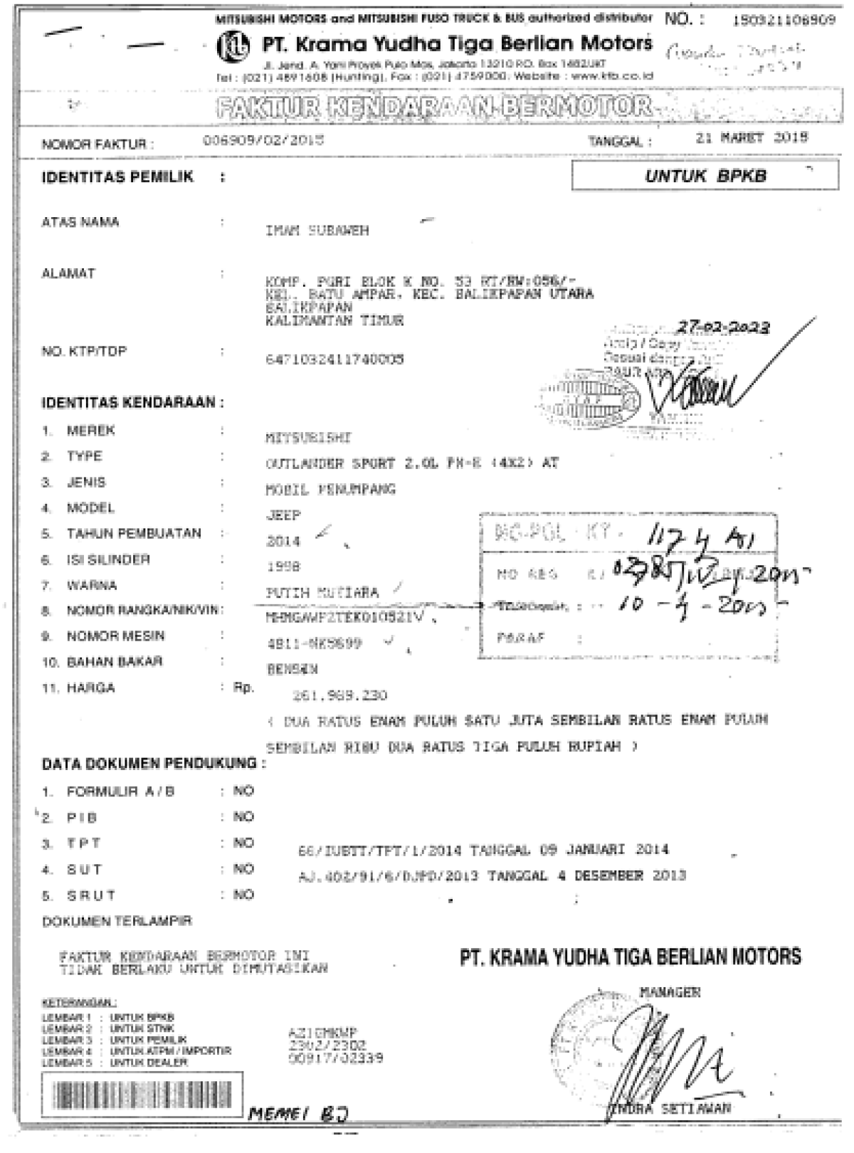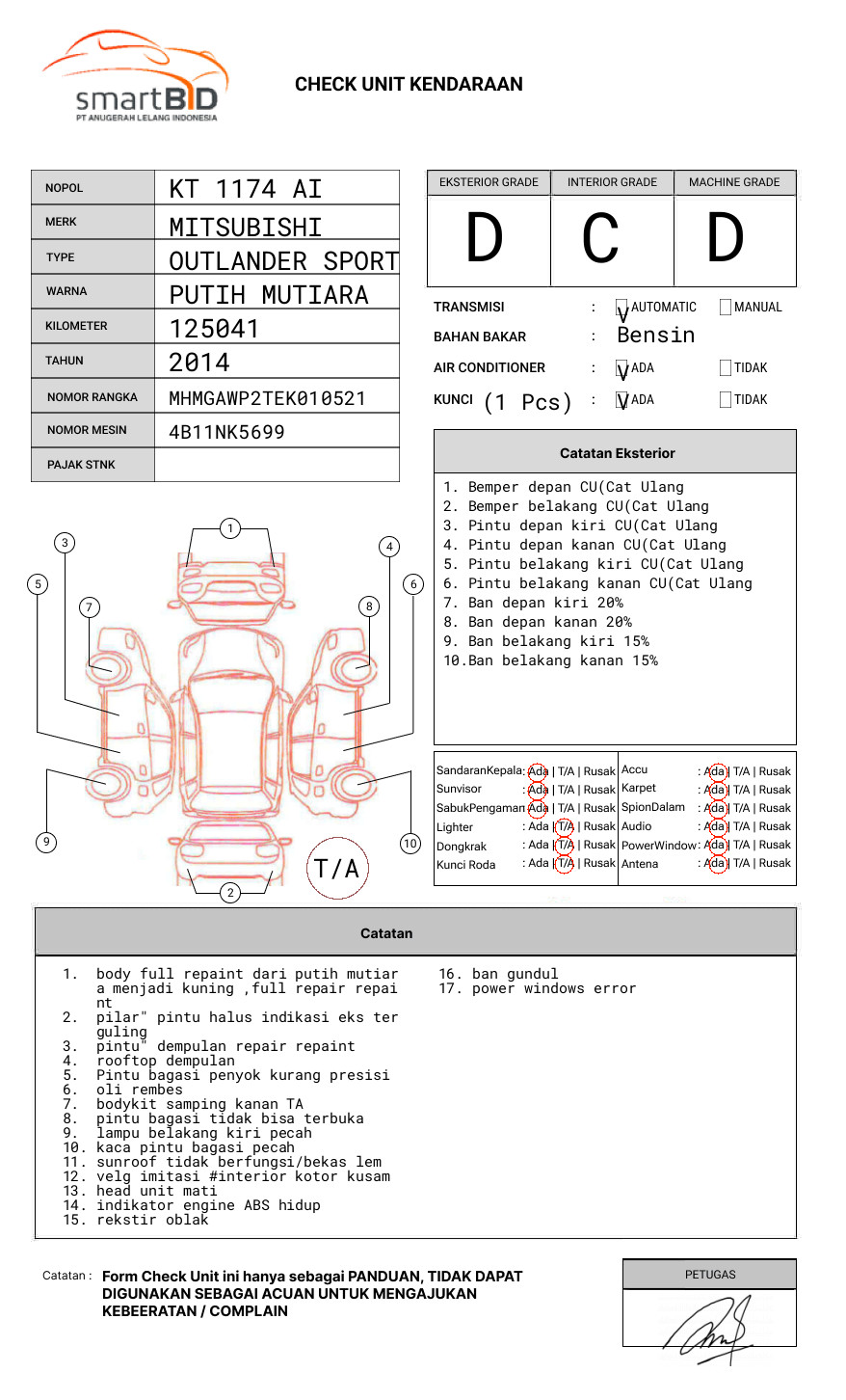 SEBELUM MELAKUKAN PENAWARAN UNIT PESERTA LELANG WAJIB MELAKUKAN PENGECEKAN UNIT DAN DOKUMEN TERLEBIH DAHULU // PIC MAS UD : 081213061687// FAKTUR BERUPA FOTOCOPY// ADA PERBEDAAN WARNA KENDARAAN PADA FISIK DAN BPKB//PADA FISIK WARNA (KUNING) PADA BPKB WARNA (PUTIH MUTIARA)// TIDAK ADA LEMBAR PERUBAHAN IDENTITAS PADA BPKB// UNIT TIDAK DAPAT DILAKUKAN CEK E-SAMSAT (PENAWAR WAJIB MENGECEK TERLEBIH DAHULU)