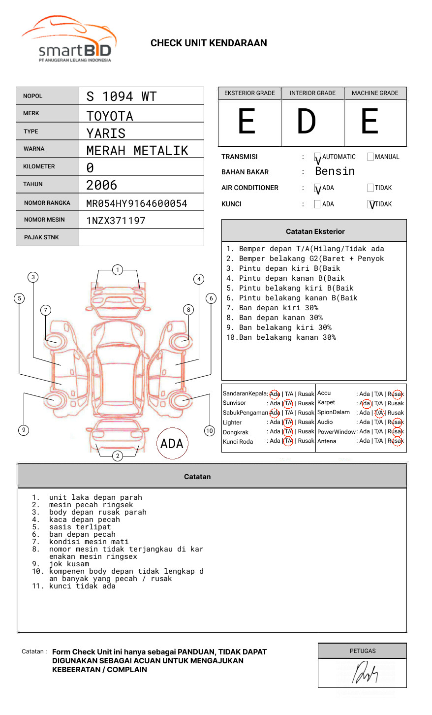 SEBELUM MELAKUKAN PENAWARAN UNIT PESERTA LELANG WAJIB MELAKUKAN PENGECEKAN UNIT DAN DOKUMEN TERLEBIH DAHULU // PIC AWAL +62 895-3231-57272 / ANDRI 085136886212 // UNIT DIKENAKAN BIAYA PPN 1.1% DARI HARGA TERBENTUK