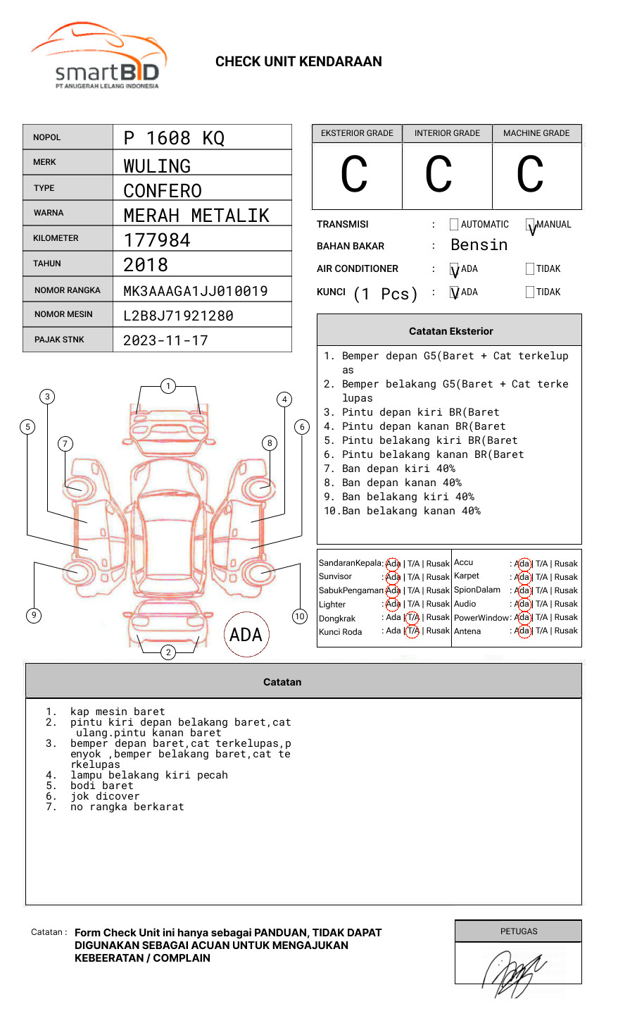 SEBELUM MELAKUKAN PENAWARAN UNIT PESERTA LELANG WAJIB MELAKUKAN PENGECEKAN UNIT DAN DOKUMEN TERLEBIH DAHULU // PIC JEMY : 0852-5833-5777 // INSPEKSI AGUNG : 0852-3671-4592 // UNIT DIKENAKAN BIAYA PPN 1.1% DARI HARGA TERBENTUK // ADA BIAYA ROYA FIDUSIA 100.000