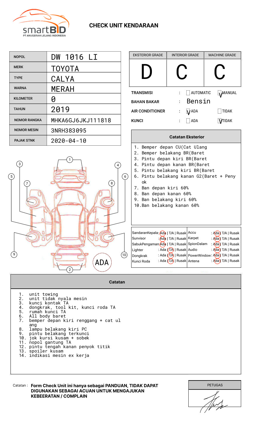 SEBELUM MELAKUKAN PENAWARAN UNIT PESERTA LELANG WAJIB MELAKUKAN PENGECEKAN UNIT DAN DOKUMEN TERLEBIH DAHULU // PIC ANDY 082189084113 // UNIT DIKENAKAN BIAYA PPN 1.1% DARI HARGA TERBENTUK // ADA BIAYA ROYA FIDUSIA 100.000