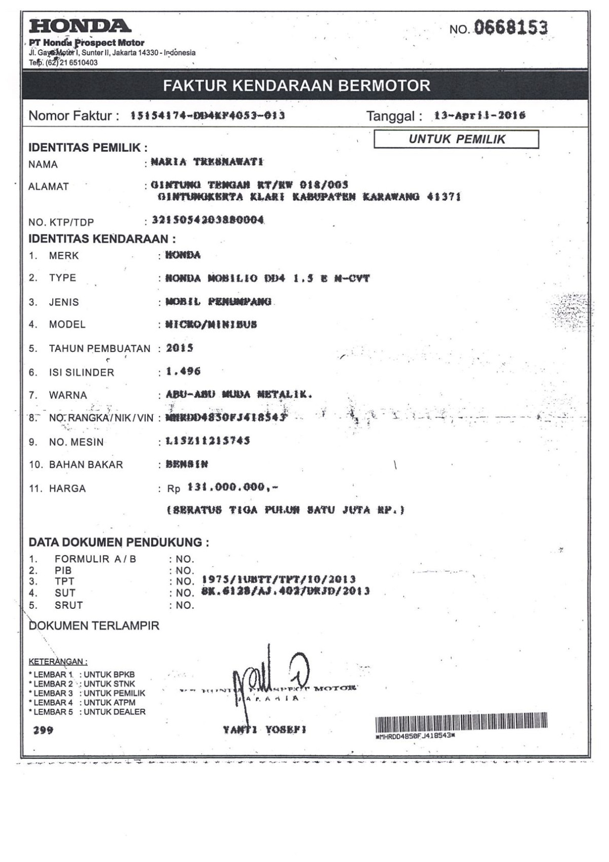 | No. Rangka | : | MHRDD4850FJ418543 |