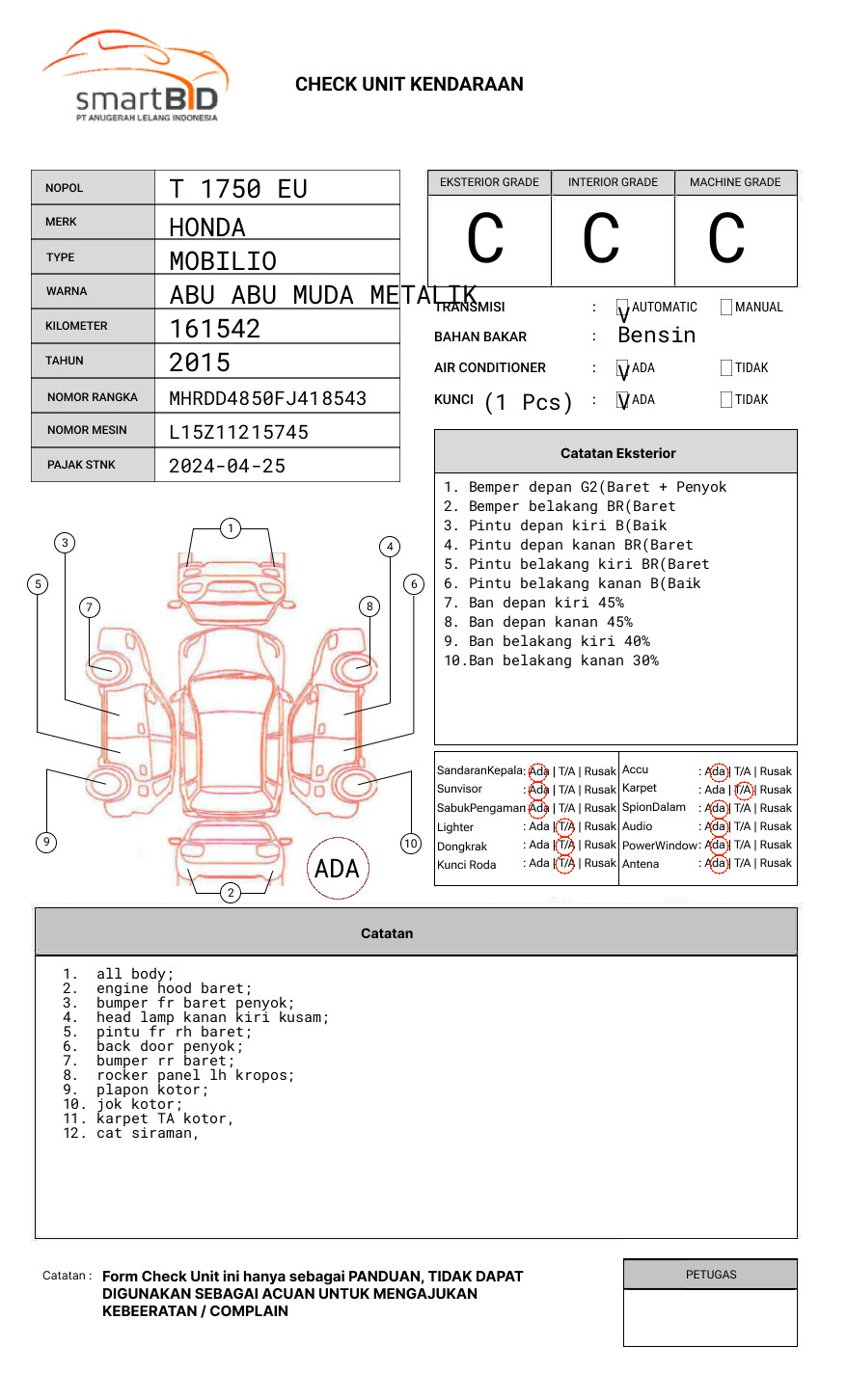 SEBELUM MELAKUKAN PENAWARAN UNIT PESERTA LELANG WAJIB MELAKUKAN PENGECEKAN UNIT DAN DOKUMEN TERLEBIH DAHULU // PIC DENNY : 0852-9442-5362 // UNIT DIKENAKAN BIAYA PPN 1.1% DARI HARGA TERBENTUK // FAKTUR DALAM BENTUK FOTOCOPY