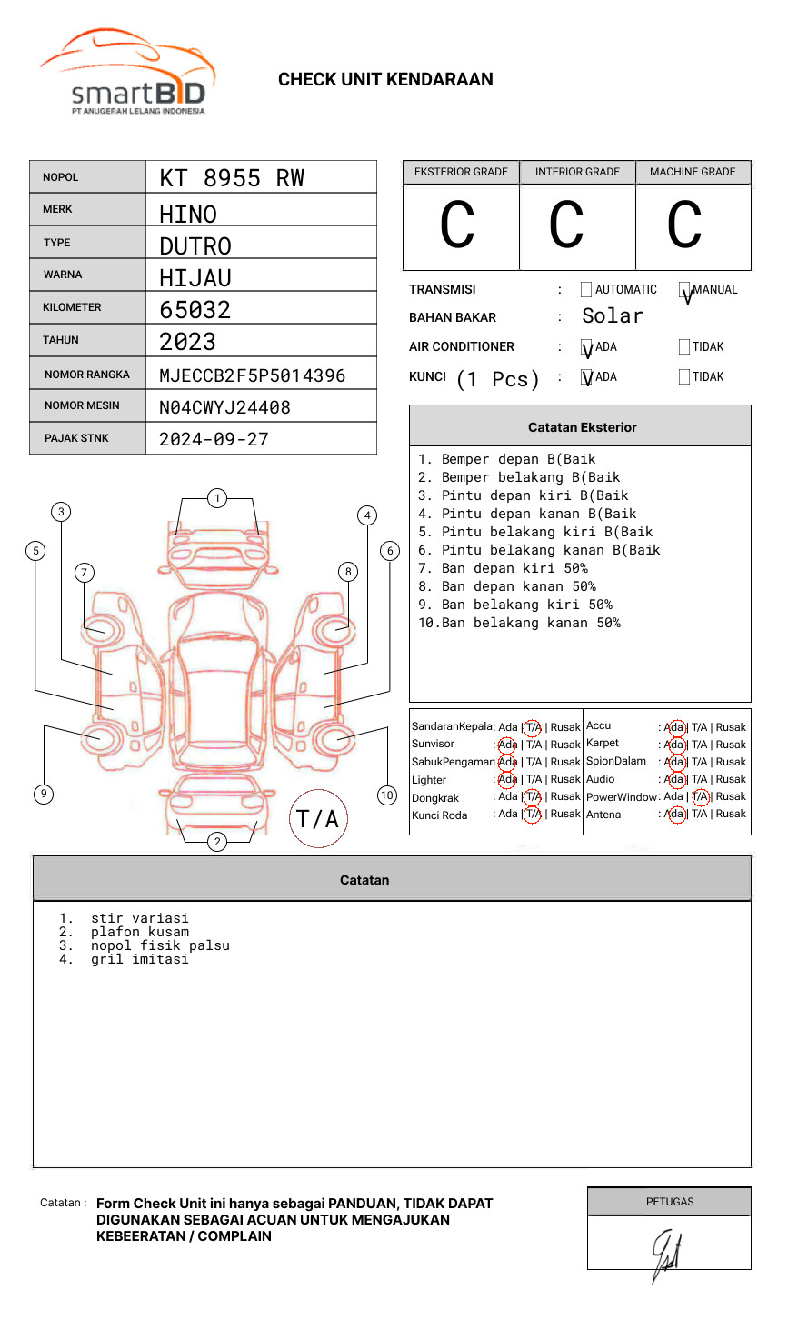 SEBELUM MELAKUKAN PENAWARAN UNIT PESERTA LELANG WAJIB MELAKUKAN PENGECEKAN UNIT DAN DOKUMEN TERLEBIH DAHULU // PIC PUTRA:+62 821-2783-7606 / GUSTI: +62 822-5053-1175 // UNIT DIKENAKAN BIAYA PPN 1.1% DARI HARGA TERBENTUK //UNIT DIKENAKAN BIAYA ROYA FIDUSIA 100.000