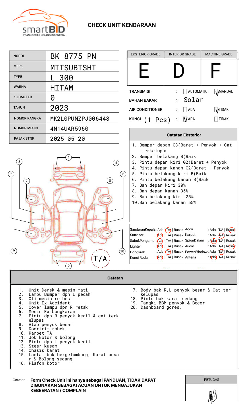 SEBELUM MELAKUKAN PENAWARAN UNIT PESERTA LELANG WAJIB MELAKUKAN PENGECEKAN UNIT DAN DOKUMEN TERLEBIH DAHULU // PIC GERMAN : 0812-6517-3060 // UNIT DIKENAKAN BIAYA PPN 1.1% DARI HARGA TERBENTUK // UNIT DIKENAKAN BIAYA ROYA FIDUSIA 100.000