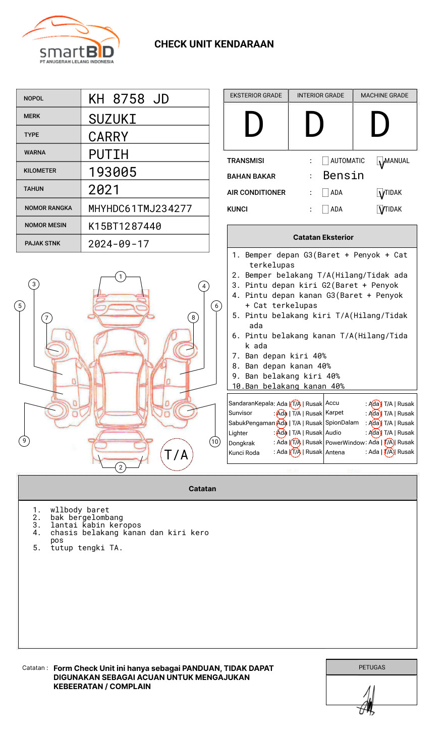 SEBELUM MELAKUKAN PENAWARAN UNIT PESERTA LELANG WAJIB MELAKUKAN PENGECEKAN UNIT DAN DOKUMEN TERLEBIH DAHULU // JHOE +62 878-6315-2679 / RIDHO 0899-1384-240 // UNIT DIKENAKAN BIAYA PPN 1.1% DARI HARGA TERBENTUK //