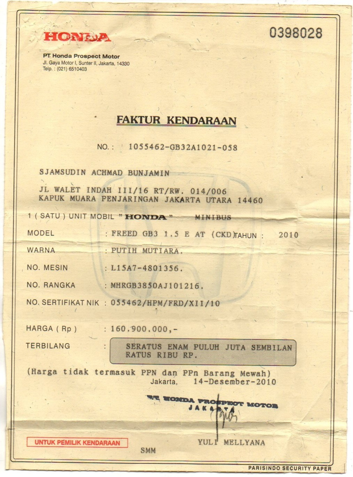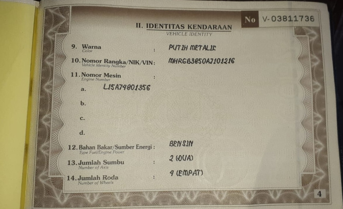 | No. Rangka | : | MHRGB3850AJ101216 |