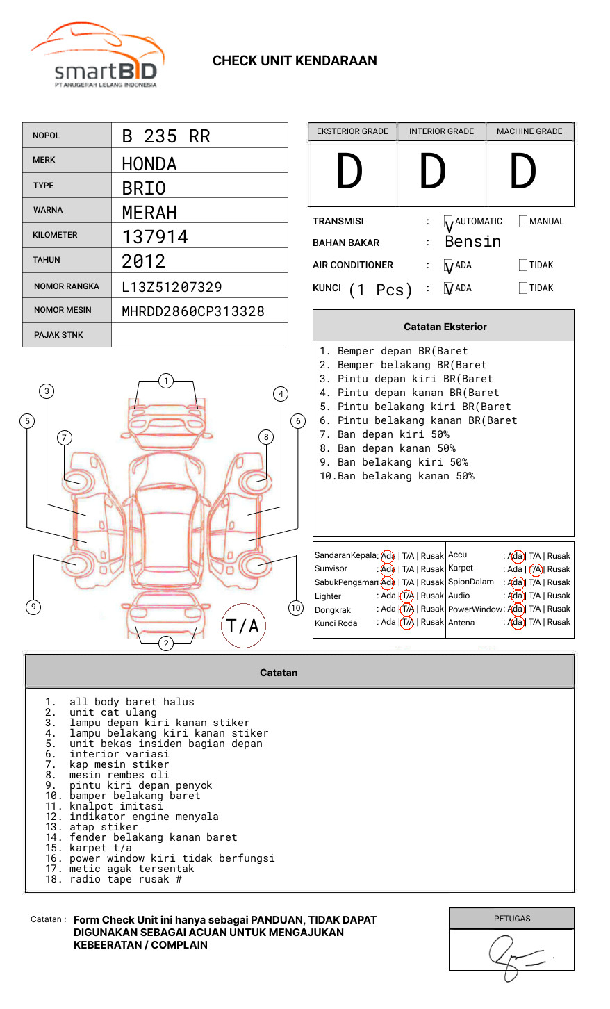 SEBELUM MELAKUKAN PENAWARAN UNIT PESERTA LELANG WAJIB MELAKUKAN PENGECEKAN UNIT DAN DOKUMEN TERLEBIH DAHULU // PIC LULU +62 856-5712-5589//UNIT DIKENAKAN BIAYA PPN 1.1% DARI HARGA TERBENTUK //