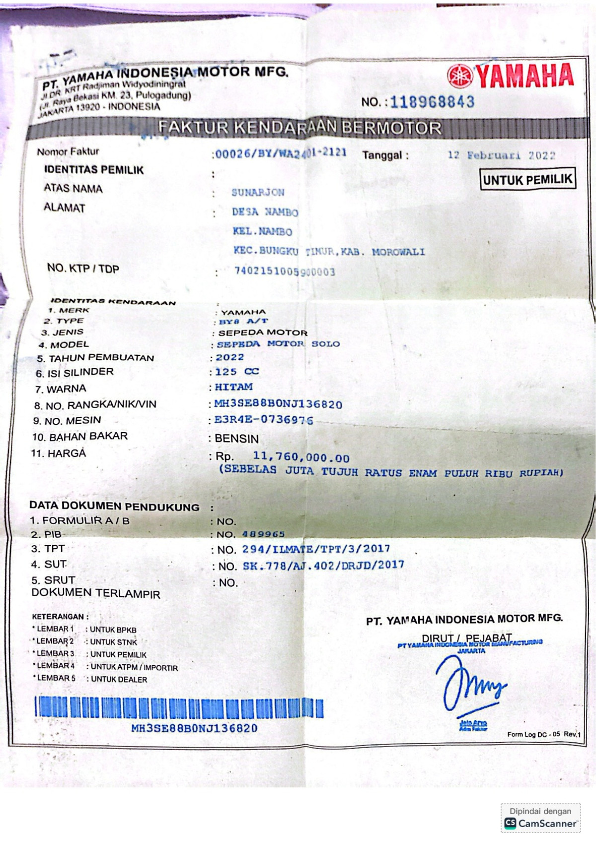 | No. Rangka | : | MH3SE88B0NJ136820 |