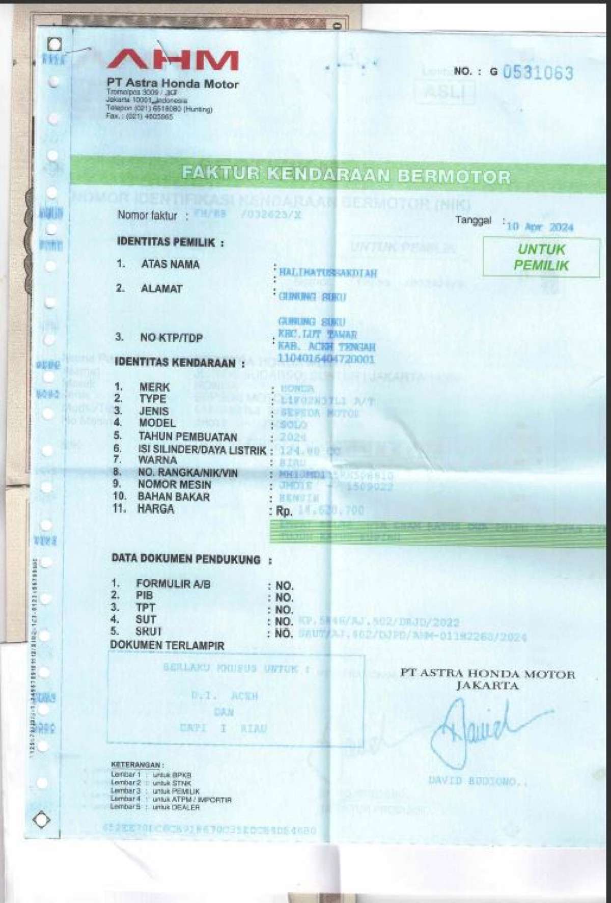 KM 18.830, MESIN HIDUP, SAYAP KANAN TERGORES, // UNIT TIDAK DILAKUKAN PENGECEKAN OLEH TIM SMARTBID// SEBELUM MELAKUKAN PENAWARAN HARAP CEK KONDISI UNIT DAN DOKUMEN TERLEBIH DAHULU// WAJIB MENGHUBUNGI PIC DAN DATANG KE LOKASI UNTUK PENGECEKAN UNIT// UNIT DILELANG APA ADANYA PERMASALAHAN YANG TIMBUL DILUAR TANGGUNG JAWAB SMARTBID// JIKA INGIN MENGAMBIL UNIT HARAP UNTUK KONFIRMASI DAHULU KE SMARTBID // JIKA YANG MENGAMBIL BIDDER HARAP MEMBAWA KTP ASLI// PENGAMBILAN UNIT H+2 HARI KERJA SETELAH PELUNASAN//