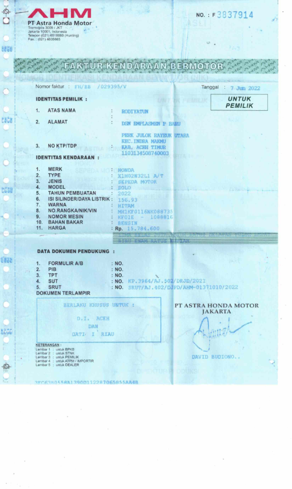 KM 37.394, MESIN SEDIKIT KASAR, SPION KIRI TA, COVER PECAH,DEK BAWAH PECAH// UNIT TIDAK DILAKUKAN PENGECEKAN OLEH TIM SMARTBID// SEBELUM MELAKUKAN PENAWARAN HARAP CEK KONDISI UNIT DAN DOKUMEN TERLEBIH DAHULU// WAJIB MENGHUBUNGI PIC DAN DATANG KE LOKASI UNTUK PENGECEKAN UNIT// UNIT DILELANG APA ADANYA PERMASALAHAN YANG TIMBUL DILUAR TANGGUNG JAWAB SMARTBID// JIKA INGIN MENGAMBIL UNIT HARAP UNTUK KONFIRMASI DAHULU KE SMARTBID // JIKA YANG MENGAMBIL BIDDER HARAP MEMBAWA KTP ASLI// PENGAMBILAN UNIT H+2 HARI KERJA SETELAH PELUNASAN// FOTO NOKA NOSIN TA //