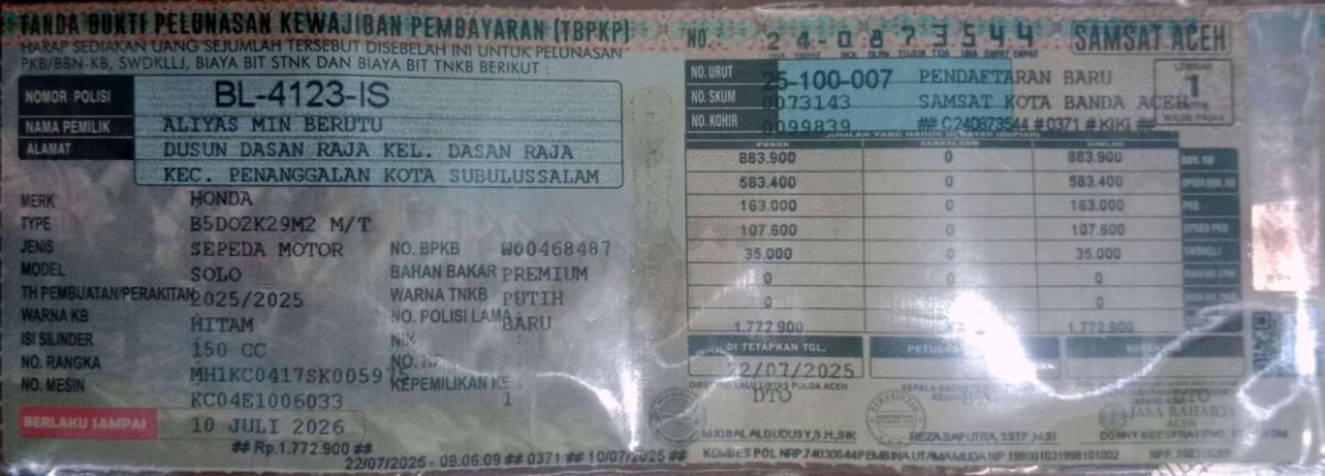 | Pajak STNK | : | 10 Juli 2026 |