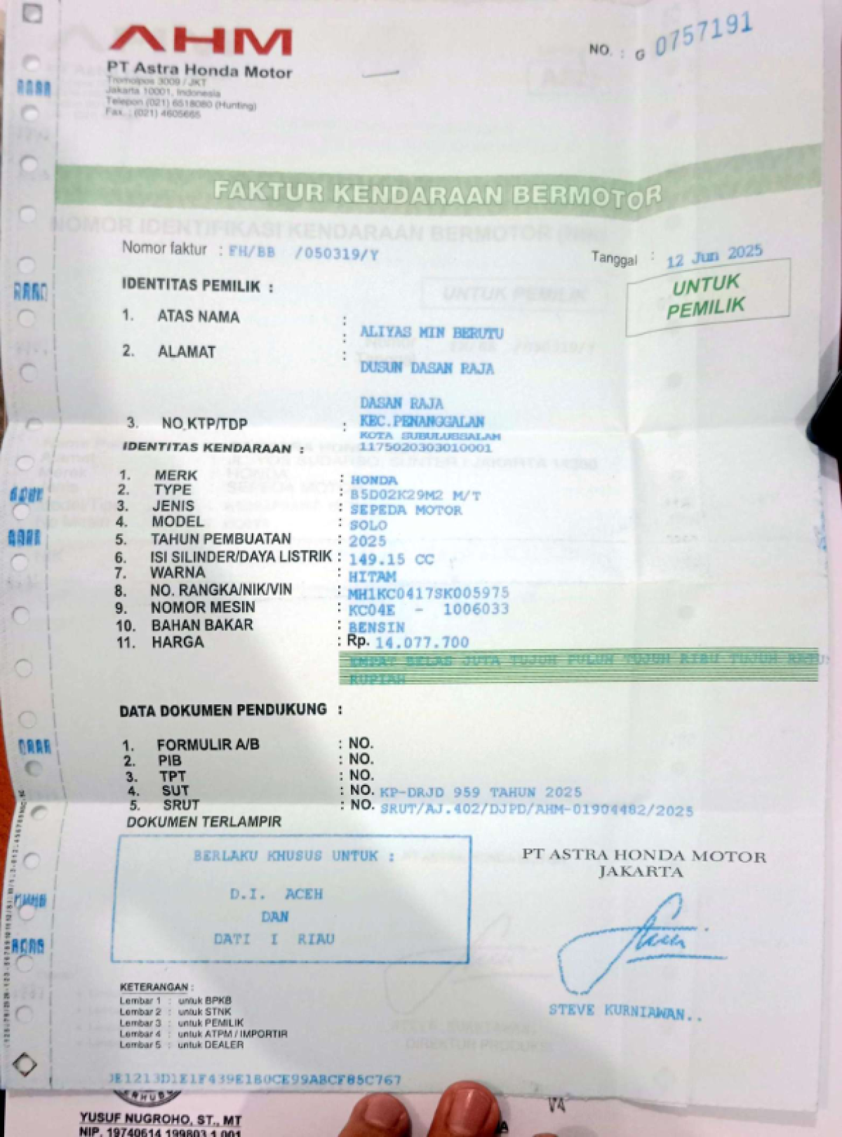 | No. Rangka | : | MH1KC0417SK005975 |