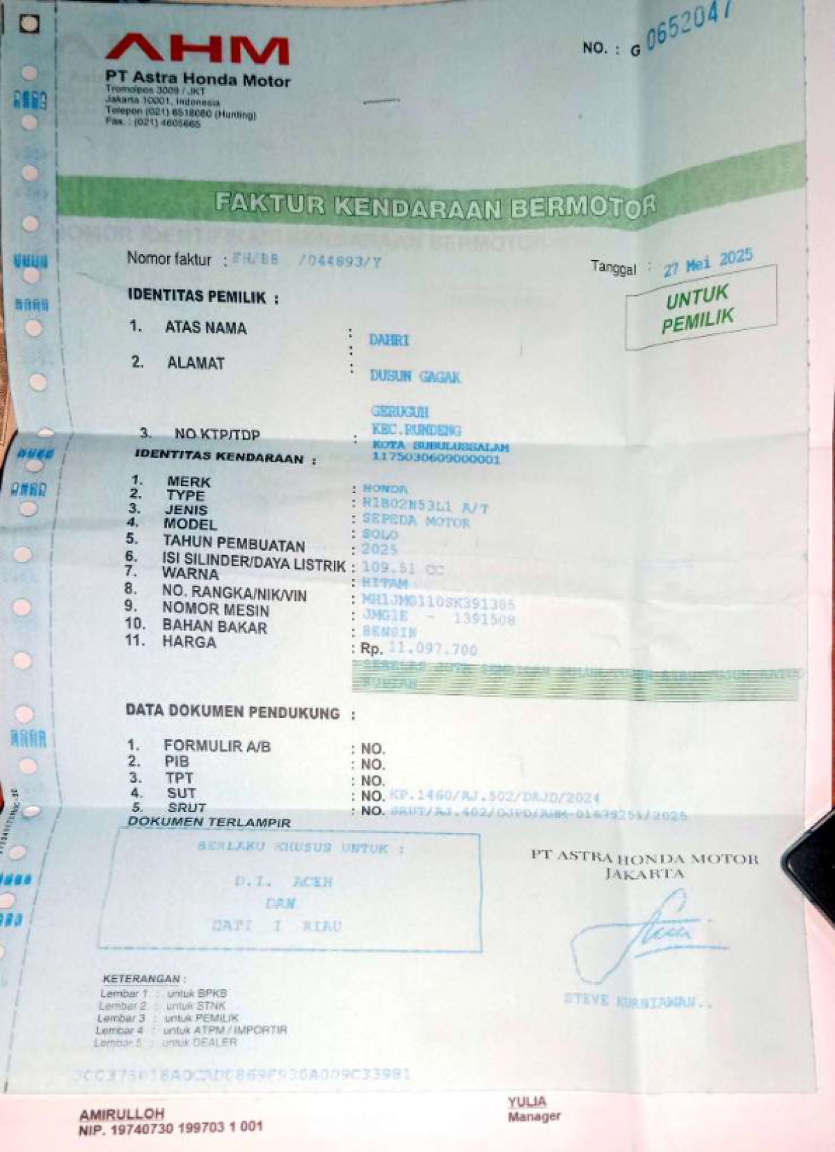 KM 3638, MESIN HIDUP (SEDIKIT NYENDAT), SEAT COMP LECET, BEHEL PATAH, LAMPU BELAKANG MATI, SPION TIDAK ADA// UNIT TIDAK DILAKUKAN PENGECEKAN OLEH TIM SMARTBID// SEBELUM MELAKUKAN PENAWARAN HARAP CEK KONDISI UNIT DAN DOKUMEN TERLEBIH DAHULU// WAJIB MENGHUBUNGI PIC DAN DATANG KE LOKASI UNTUK PENGECEKAN UNIT// UNIT DILELANG APA ADANYA PERMASALAHAN YANG TIMBUL DILUAR TANGGUNG JAWAB SMARTBID// JIKA INGIN MENGAMBIL UNIT HARAP UNTUK KONFIRMASI DAHULU KE SMARTBID // JIKA YANG MENGAMBIL BIDDER HARAP MEMBAWA KTP ASLI// PENGAMBILAN UNIT H+2 HARI KERJA SETELAH PELUNASAN////