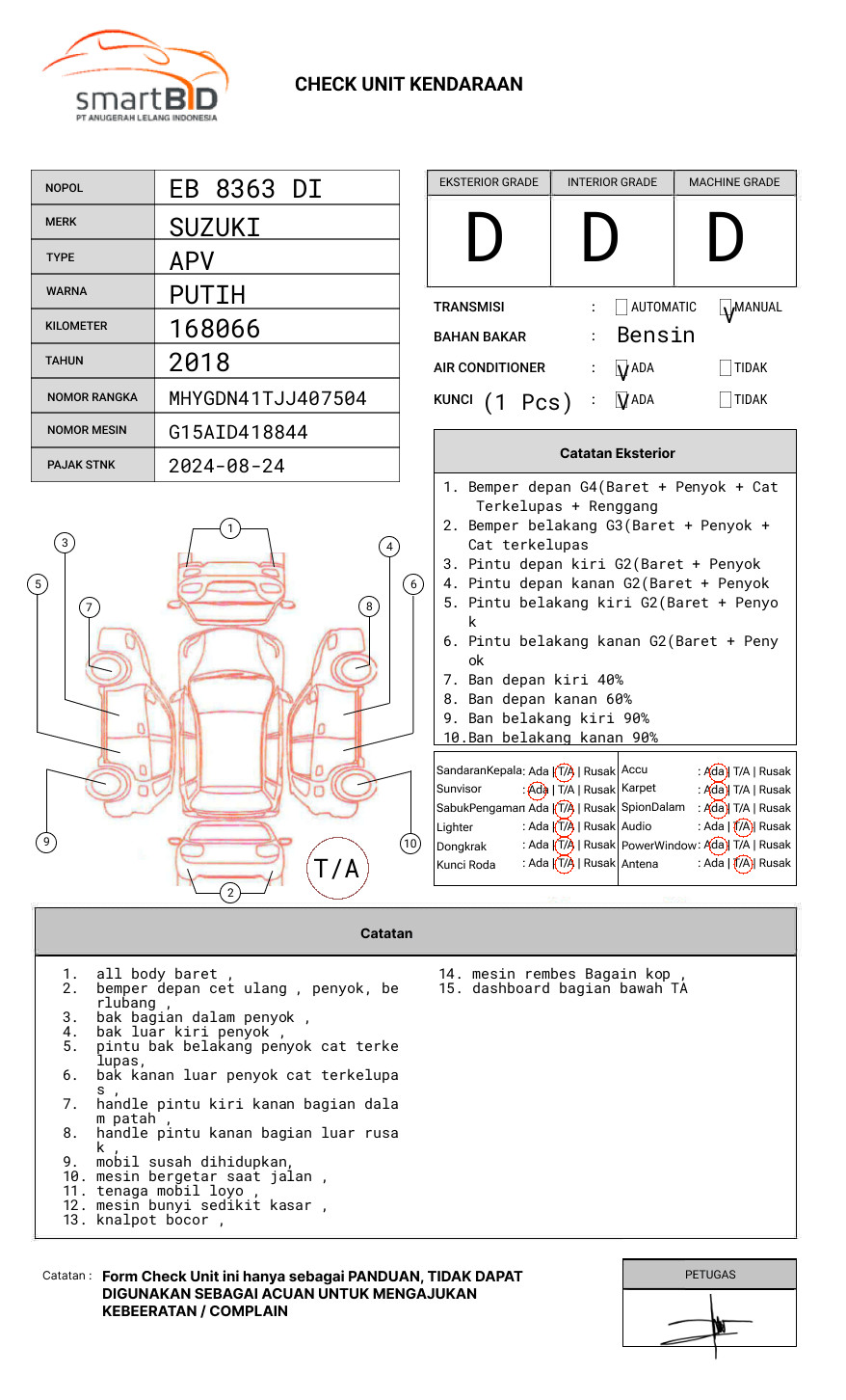 SEBELUM MELAKUKAN PENAWARAN UNIT PESERTA LELANG WAJIB MELAKUKAN PENGECEKAN UNIT DAN DOKUMEN TERLEBIH DAHULU // PIC RACHMAT +6282145035002 // UNIT DIKENAKAN BIAYA PPN 1.1% DARI HARGA TERBENTUK // BPKB MASIH MENGGUNAKAN NOPOL LAMA EB 9770 D // TIDAK ADA KET RUBAH NOPOL PADA BPKB // INDIKASI BBN GANTUNG