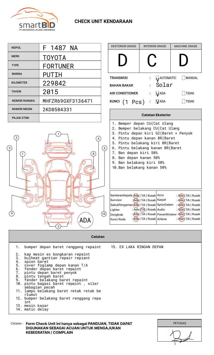 SEBELUM MELAKUKAN PENAWARAN UNIT PESERTA LELANG WAJIB MELAKUKAN PENGECEKAN UNIT DAN DOKUMEN TERLEBIH DAHULU // PIC AWAL +62 895-3231-57272 // UNIT DIKENAKAN BIAYA PPN 1.1% DARI HARGA TERBENTUK // NOPOL FISIK TA // FAKTUR DALAM BENTUK COPY//NOPOL KENDARAAN "F 1487 NA"//