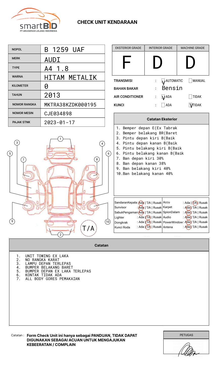 SEBELUM MELAKUKAN PENAWARAN UNIT PESERTA LELANG WAJIB MELAKUKAN PENGECEKAN UNIT DAN DOKUMEN TERLEBIH DAHULU // PIC TIAN : +62 896-6265-5959 // UNIT DIKENAKAN BIAYA PPN 1.1% DARI HARGA TERBENTUK // NOSIN BERKARAT