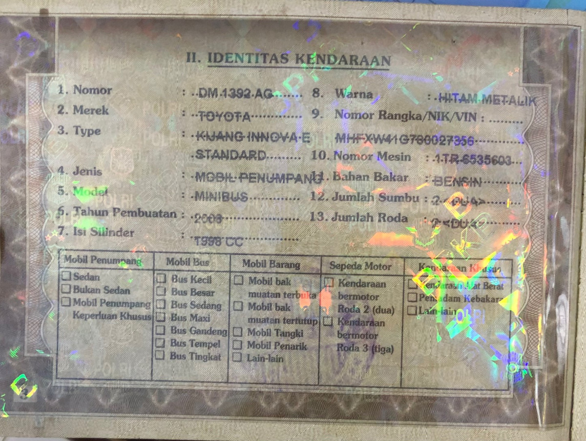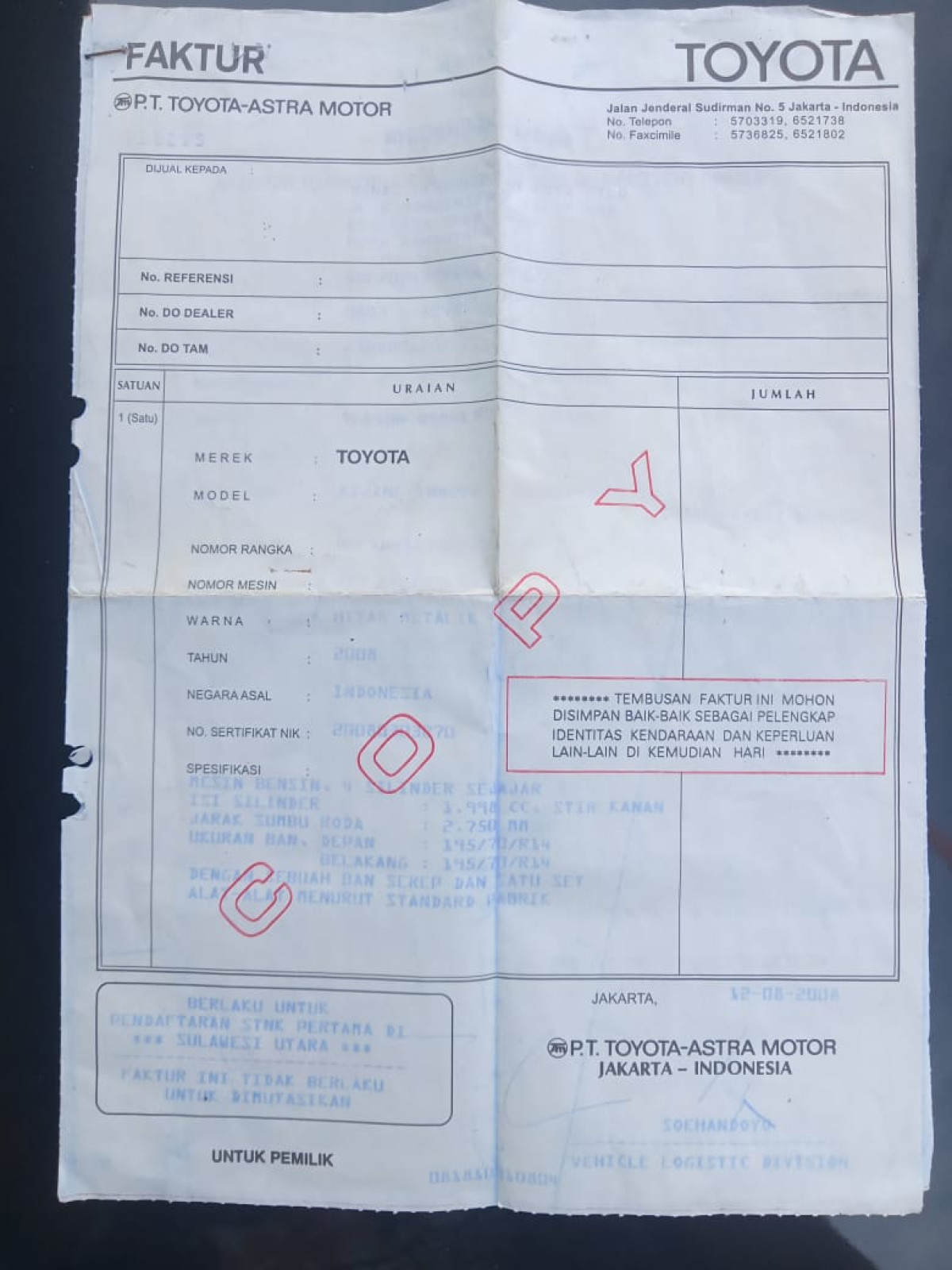 UNIT TIDAK DILAKUKAN PENGECEKAN OLEH TIM SMARTBID// SEBELUM MELAKUKAN PENAWARAN HARAP CEK KONDISI UNIT DAN DOKUMEN TERLEBIH DAHULU// WAJIB MENGHUBUNGI PIC DAN DATANG KE LOKASI UNTUK PENGECEKAN UNIT// UNIT DILELANG APA ADANYA PERMASALAHAN YANG TIMBUL DILUAR TANGGUNG JAWAB SMARTBID// PENGAMBILAN UNIT SLIDE H+2 DARI PELUNASAN // JIKA INGIN MENGAMBIL UNIT HARAP UNTUK KONFIRMASI DAHULU KE SMARTBID // JIKA YANG MENGAMBIL BIDDER HARAP MEMBAWA KTP ASLI // JIKA PENGAMBILAN DIWAKILKAN WAJIB MEMBAWA SURAT KUASA ASLI // UNIT DIKENAKAN BIAYA PPN 1,1% DARI HARGA TERBENTUK// LOKASI UNIT HUBUNGI PIC Bpk. Massuarah 0813-5561-8851 // CS PUSAT 081188089292// Mesin tidak berfungsi (piston seher), Body tergores, Alat mobil tidak ada, Grill depan imitasi, Knalpot imitasi, Velg imitasi, Head unit imitasi, Laci dashboard tidak ada, Seatbelt depan tidak ada, Headrest depan kanan tidak ada, Mesin rembes oli//Muffler | Aircon Evaporator | Clutch Bearing | Clutch Plate | Fan Belt | Brake Master | Gasket Cylinder Head | Engine Services (Heavy) | Tire (Rr-L) | Rack Steer | Tire (Rr-R) | Tire (spare) | Radiator | Tire (Fr-L) | Gasket Cover Head | Tire (Fr-R) | Radiator Fan | Battery | Coil Ignition | Spark Plug(s) | Brake Pad (Fr) | Brake Pad (Rr) | Spring (FR) | Spring (RR) | Injector/Interior Saloon | Carpet Floor (FR-R) | Carpet Floor (RR) | Carpet Floor (Mid) | Carpet | Carpet Floor (FR-L) | Bolt Crane and Jack | Tool Kit | Seatbelt (Fr-L) | Ceiling Lamp (Rr) | Ceiling Trim | Seatbelt (Fr-R) | Ceiling Lamp (Fr) | Headrest (Fr-R) | Head Unit | Dashboard/Door Repair (Fr-L) | Door Repair (Fr-R) | Door Repair (Rr-R) | Door Repair (Rr-L) | Engine Hood Repair | Fender Repair (Rr-L) | Turn Lamp (Fr-L) | Taillight (Rr-L) | Bumper Repair (Fr) | Headlight (Fr-L) | Side Skirt Repair (R) | Headlight (Fr-R) | Grilles | Windshield Wiper | Door Repair (Trunk) | Rim cover (Rr-L) | Taillight (Rr-R) | Fender Repair (Fr-R) | Fender Repair (Rr-R) | Bumper Repair (Rr) | Turn Lamp (Fr-R) | Roof Repair | Turn Lamp (Rr-L) | Mirror (L) | Fender Repair (Fr-L) | Mirror (R ) | Side Skirt Repair (L) | Turn Lamp (Rr-R)