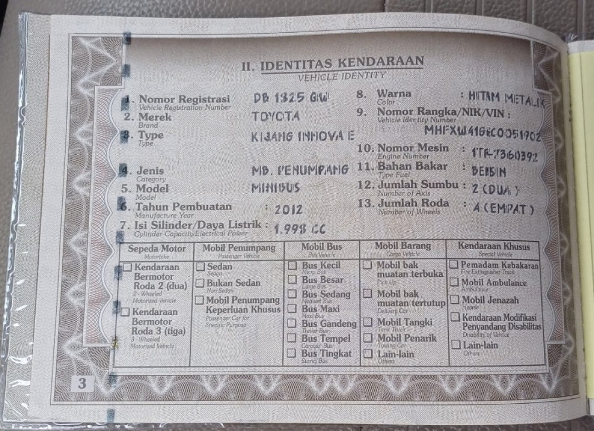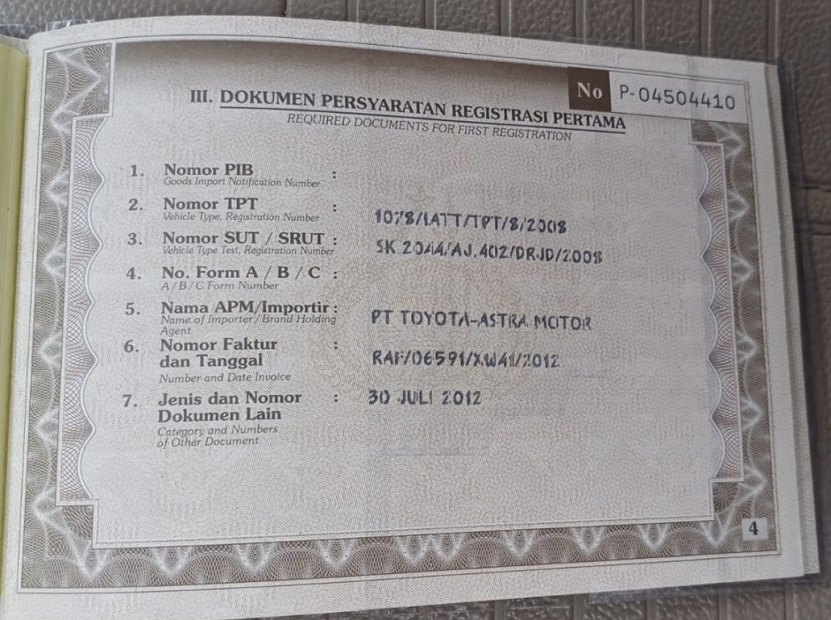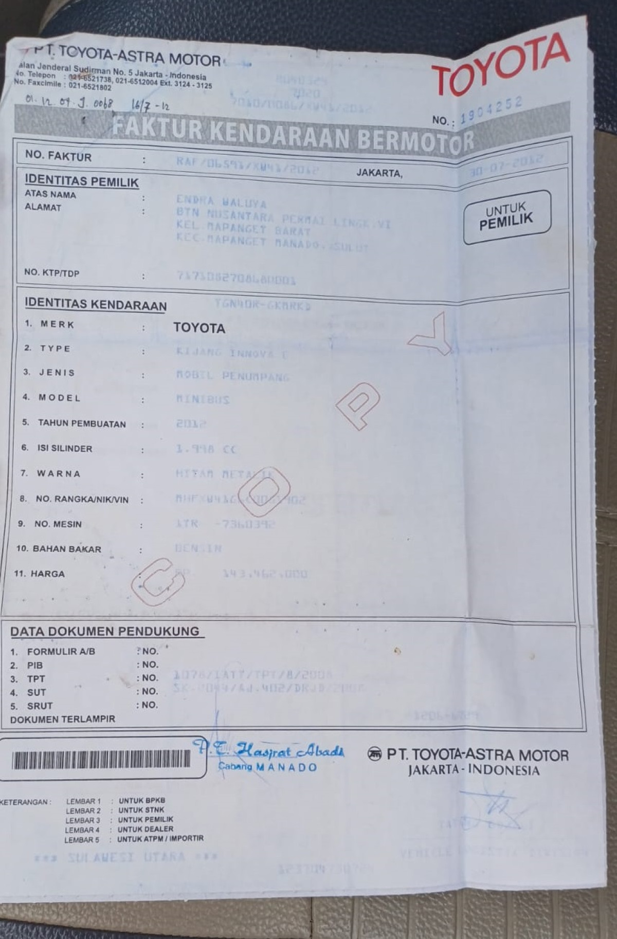 NOPOL FISIK TA// UNIT TIDAK DILAKUKAN PENGECEKAN OLEH TIM SMARTBID// SEBELUM MELAKUKAN PENAWARAN HARAP CEK KONDISI UNIT DAN DOKUMEN TERLEBIH DAHULU// WAJIB MENGHUBUNGI PIC DAN DATANG KE LOKASI UNTUK PENGECEKAN UNIT// UNIT DILELANG APA ADANYA PERMASALAHAN YANG TIMBUL DILUAR TANGGUNG JAWAB SMARTBID// PENGAMBILAN UNIT SLIDE H+2 DARI PELUNASAN // JIKA INGIN MENGAMBIL UNIT HARAP UNTUK KONFIRMASI DAHULU KE SMARTBID // JIKA YANG MENGAMBIL BIDDER HARAP MEMBAWA KTP ASLI // JIKA PENGAMBILAN DIWAKILKAN WAJIB MEMBAWA SURAT KUASA ASLI // UNIT DIKENAKAN BIAYA PPN 1,1% DARI HARGA TERBENTUK// LOKASI UNIT HUBUNGI PIC Bpk. Paul 0823-1581-4593 // CS PUSAT 081188089292// Mesin berfungsi, Body tergores, Ban cadangan tidak ada, Alat mobil tidak ada, Emblem tidak lengkap, Velg imitasi, Sparkboard tidak ada, Setir imitasi, Head unit imitasi, Penutup laci dashboard tidak ada, Mesin rembes oli//Spring (RR) | Gasket Cylinder Head | Tire (spare) | Tire (Rr-R) | Clutch Bearing | Tire (Fr-R) | Spring (FR) | Gasket Cover Head | Coil Ignition | Fan Belt | Rim (spare) | Rack Steer | Engine Services (Light) | Injector | Shocbreakers (Rr) | Tire (Rr-L) | Tire (Fr-L) | Clutch Plate | Spark Plug(s) | Radiator Fan | Shocbreakers (Fr) | Brake Pad (Rr) | Brake Pad (Fr) | Brake Master | Aircon Evaporator | Battery/Carpet Floor (Mid) | Carpet Floor (RR) | Carpet Floor (FR-L) | Aircon Panel | Steering-wheel | Head Unit | Ceiling Lamp (Fr) | Ceiling Trim | Carpet Floor (FR-R) | Interior Saloon | Bolt Crane and Jack | Ceiling Lamp (Rr) | Carpet | Tool Kit | Dashboard/Turn Lamp (Rr-R) | Mirror (R ) | Turn Lamp (Fr-L) | Headlight (Fr-R) | Turn Lamp (Rr-L) | Emblem | Headlight (Fr-L) | Turn Lamp (Fr-R) | Windshield Wiper | Fog Lamp (L) | License Plate | Fog Lamp (R ) | Roof Repair | Fender Repair (Fr-R) | Bumper Repair (Fr) | Bumper Repair (Rr) | Fender Repair (Rr-L) | Fender Repair (Fr-L) | Fender Repair (Rr-R) | Door Repair (Trunk) | Mirror (L) | Side Skirt Repair (R) | Engine Hood Repair | Rim cover (Fr-L) | Side Skirt Repair (L)