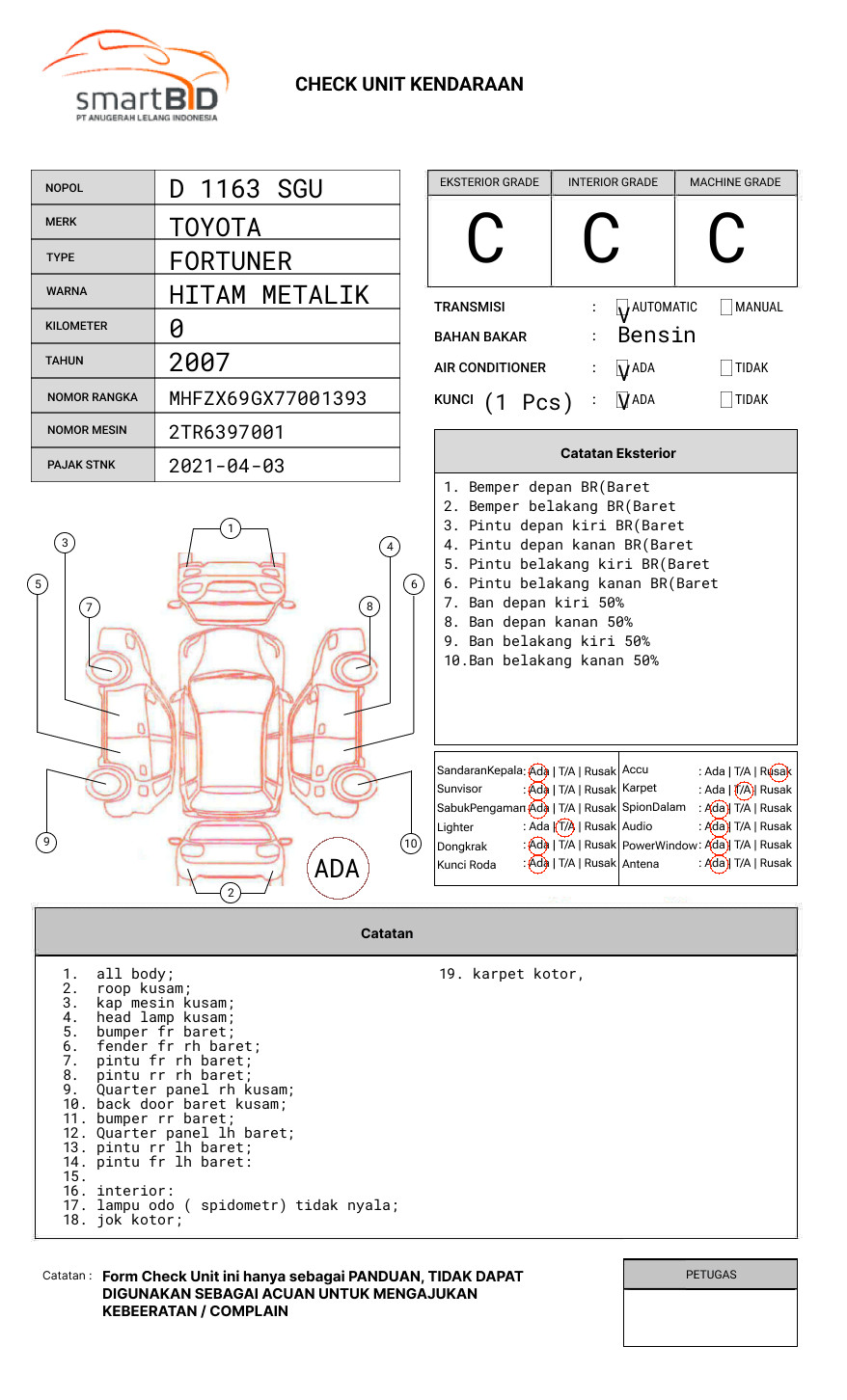 SEBELUM MELAKUKAN PENAWARAN UNIT PESERTA LELANG WAJIB MELAKUKAN PENGECEKAN UNIT DAN DOKUMEN TERLEBIH DAHULU // PIC DENNY : 0852-9442-5362 // UNIT DIKENAKAN BIAYA PPN 1.1% DARI HARGA TERBENTUK //