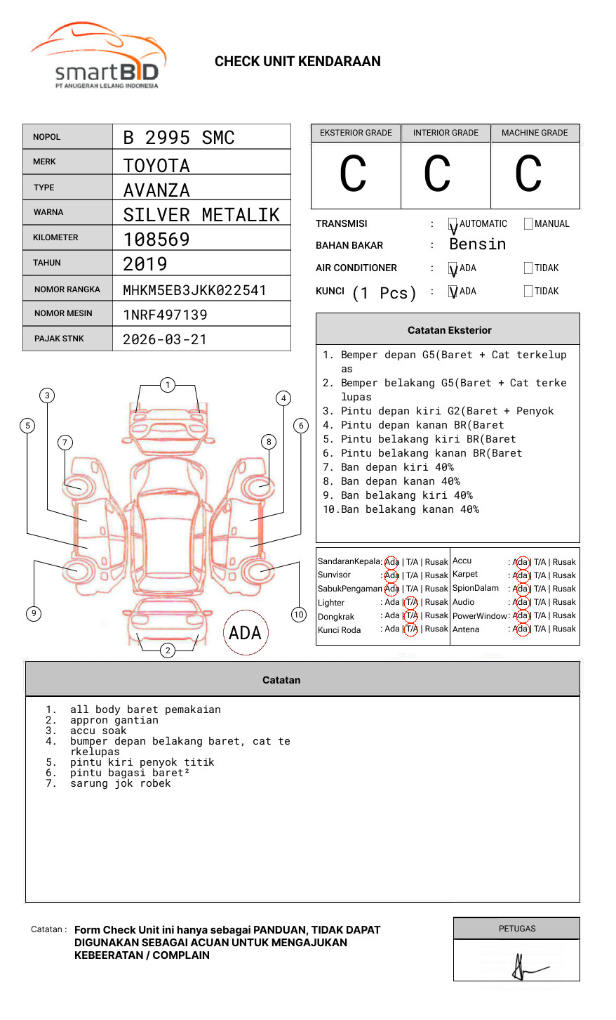 SEBELUM MELAKUKAN PENAWARAN UNIT PESERTA LELANG WAJIB MELAKUKAN PENGECEKAN UNIT DAN DOKUMEN TERLEBIH DAHULU // 1 DIGIT AKHIR NOKA FISIK TIPIS// TERDAPAT PERBEDAAN NOPOL FISIK & STNK DGN NOPOL PADA BPKB// NOPOL PADA FISK & STNK "B 2995 SMC" SEDANGKAN NOPOL PADA BPKB "B 2525 PFV"// INDIKASI BBN GANTUNG// PIC WAHYU : 082124062748// LEMBAR PERUBAHAN NOPOL DI BPKB TA// FAKTUR DALAM BENTUK COPY
