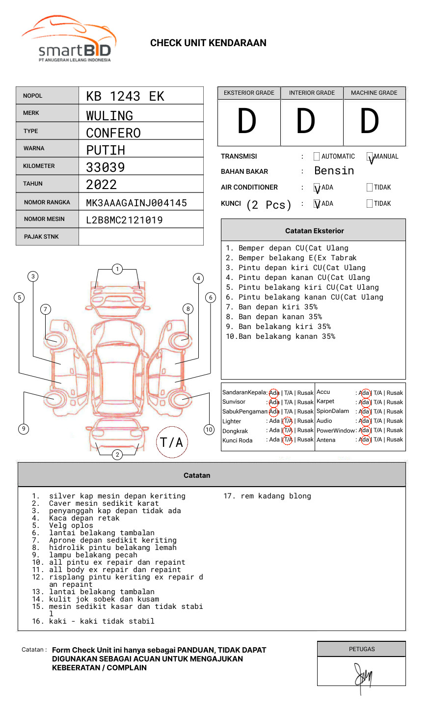 SEBELUM MELAKUKAN PENAWARAN UNIT PESERTA LELANG WAJIB MELAKUKAN PENGECEKAN UNIT DAN DOKUMEN TERLEBIH DAHULU // PIC WAHYU : 082124062748// SOFTCOPY BPKB-FAKTUR TA// UNIT TIDAK DAPAT DILAKUKAN CEK E-SAMSAT (PENAWAR WAJIB MENGECEK TERLEBIH DAHULU)