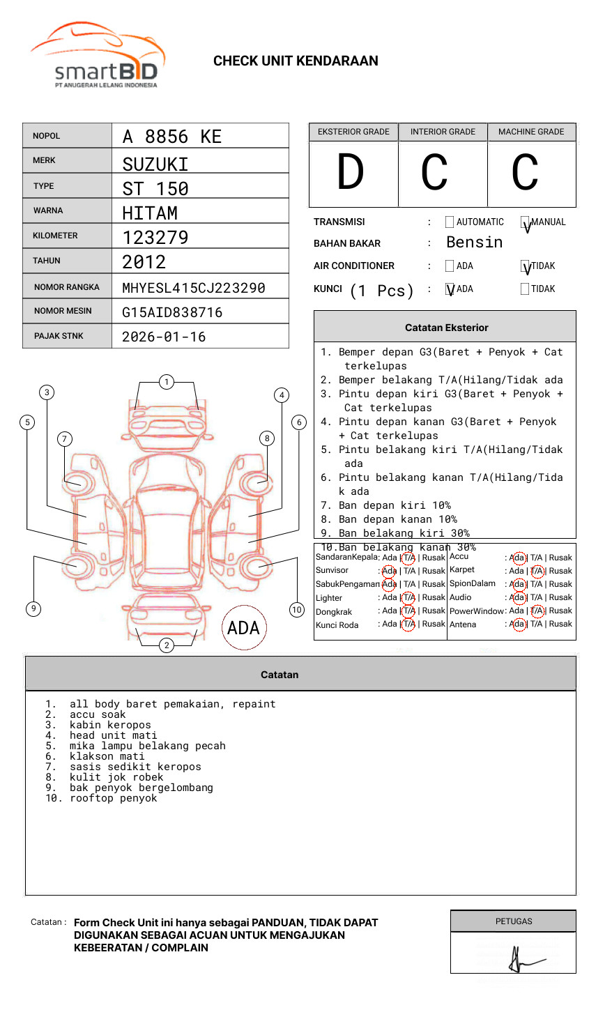 SEBELUM MELAKUKAN PENAWARAN UNIT PESERTA LELANG WAJIB MELAKUKAN PENGECEKAN UNIT DAN DOKUMEN TERLEBIH DAHULU // PIC WAHYU : 082124062748// UNIT DIKENAKAN BIAYA PPN 1.1% DARI HARGA TERBENTUK //