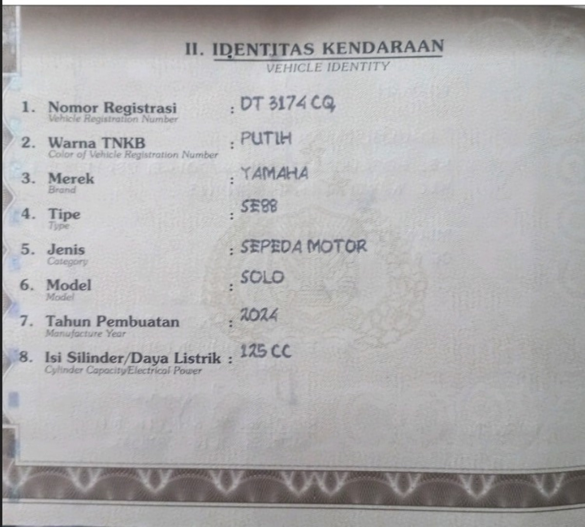 | No. Polisi | : | DT 3174 CQ |