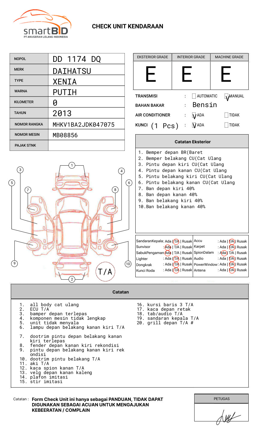 SEBELUM MELAKUKAN PENAWARAN UNIT PESERTA LELANG WAJIB MELAKUKAN PENGECEKAN UNIT DAN DOKUMEN TERLEBIH DAHULU // PIC LULU +62 856-5712-5589//UNIT DIKENAKAN BIAYA PPN 1.1% DARI HARGA TERBENTUK // NOPOL FISIK T/A //