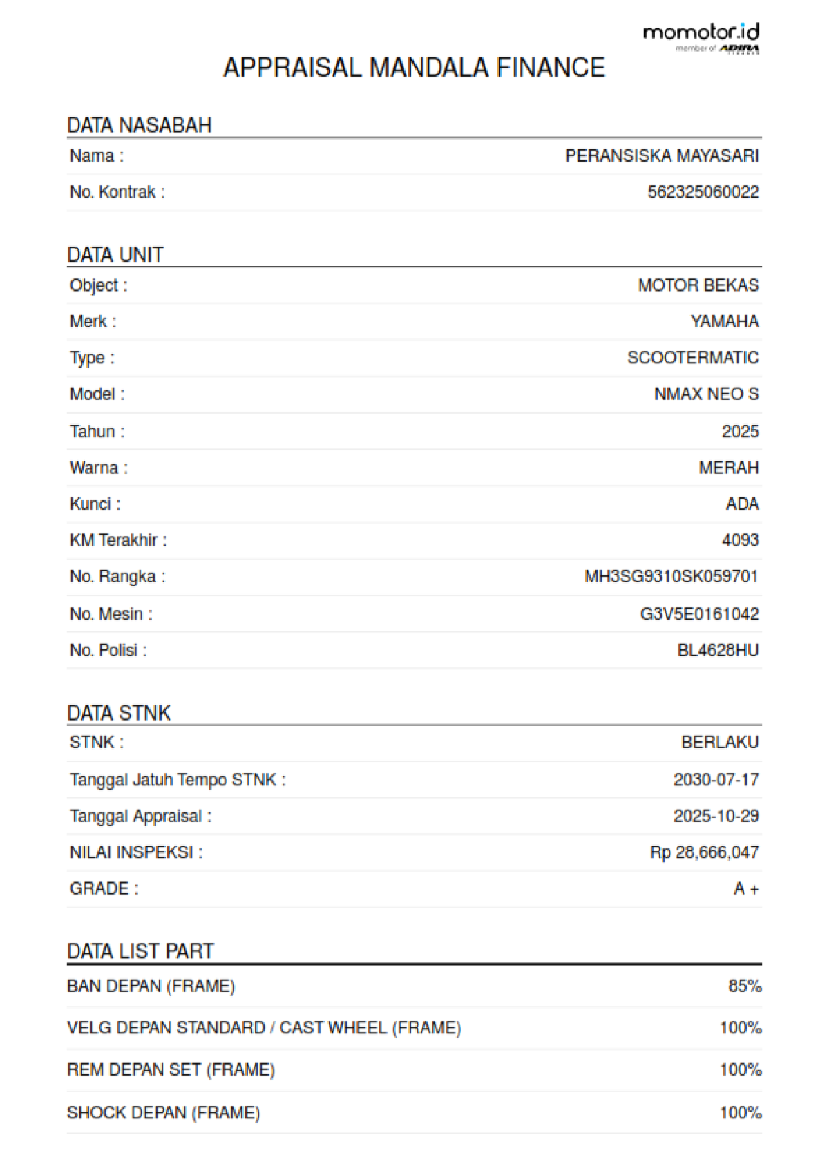 KM 4.093, MESIN NORMAL// UNIT TIDAK DILAKUKAN PENGECEKAN OLEH TIM SMARTBID// SEBELUM MELAKUKAN PENAWARAN HARAP CEK KONDISI UNIT DAN DOKUMEN TERLEBIH DAHULU// WAJIB MENGHUBUNGI PIC DAN DATANG KE LOKASI UNTUK PENGECEKAN UNIT// UNIT DILELANG APA ADANYA PERMASALAHAN YANG TIMBUL DILUAR TANGGUNG JAWAB SMARTBID// JIKA INGIN MENGAMBIL UNIT HARAP UNTUK KONFIRMASI DAHULU KE SMARTBID // JIKA YANG MENGAMBIL BIDDER HARAP MEMBAWA KTP ASLI// PENGAMBILAN UNIT H+2 HARI KERJA SETELAH PELUNASAN// FOTO NOKA DAN NOSIN TA//