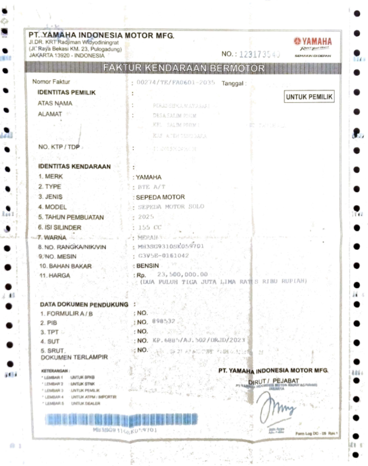 | No. Rangka | : | MH3SG9310SK059701 |