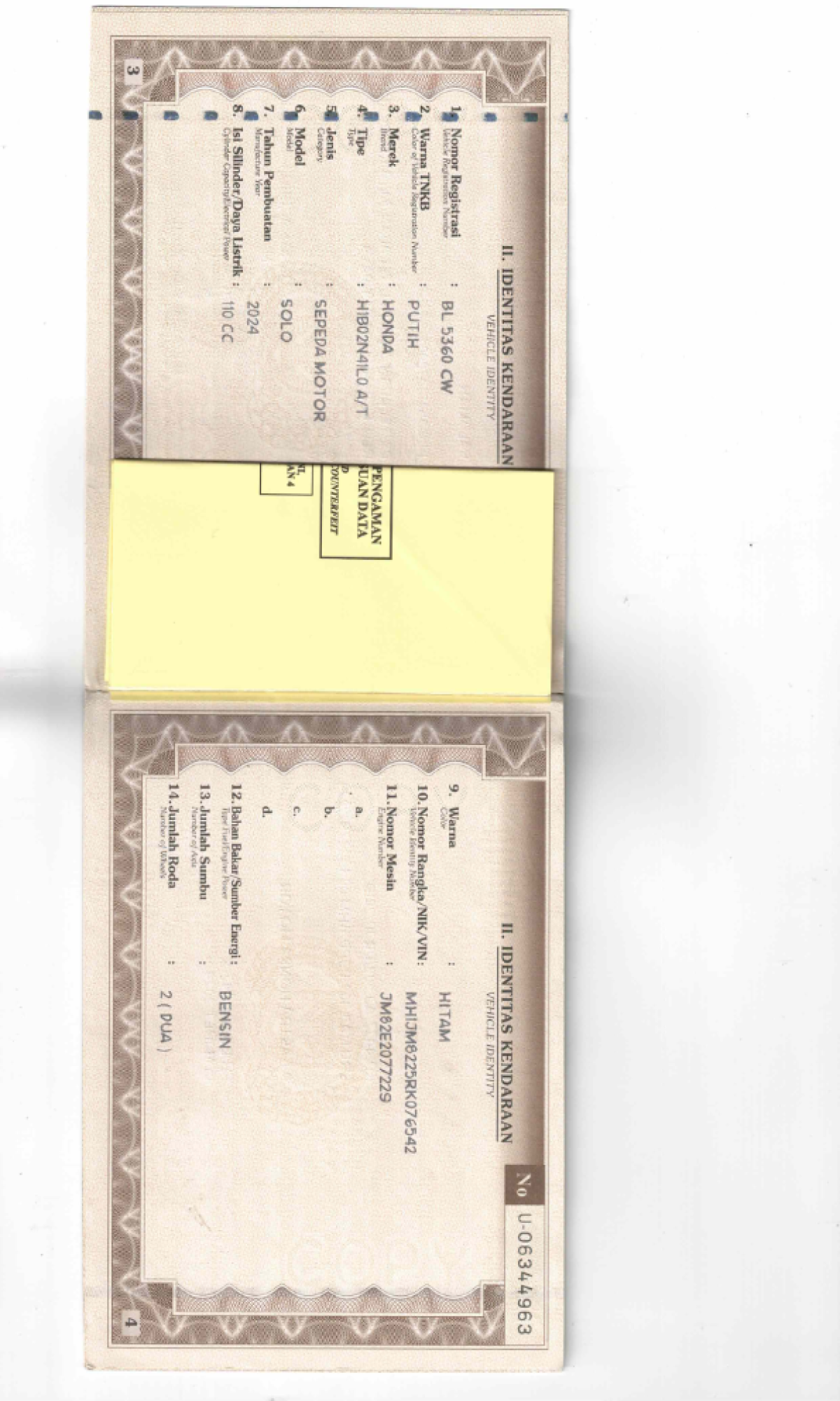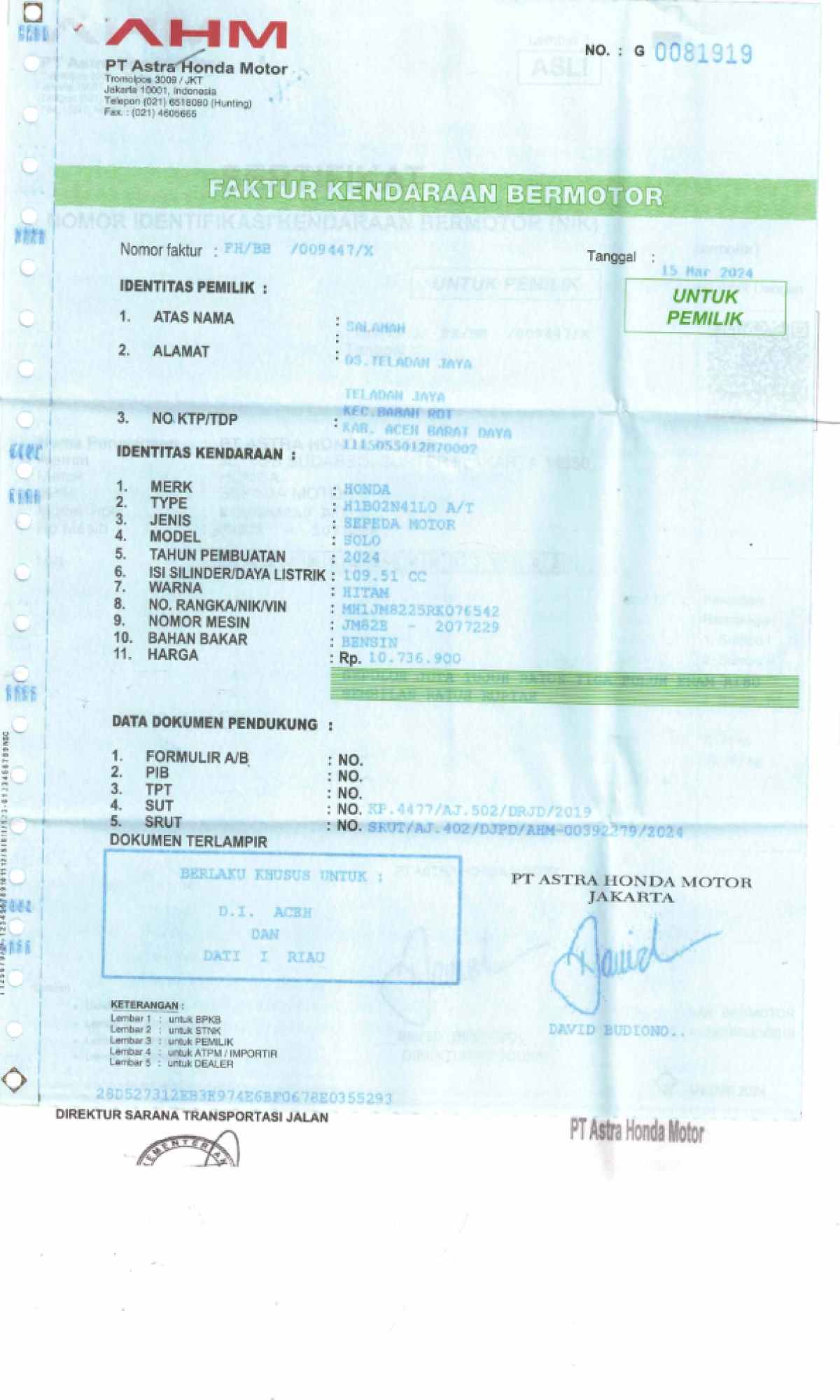 KM 0, UNIT MATI, AKI SOAK, JOK SUDAH GANTI, COVER MESIN TA, DEK BAWAH COPOT, BODY DEPAN BARET, SPAKBOR DEPAN BARET, TUTUP LAMPU BELAKANG TA, COVER DEK LUMPUR DEPAN PATAH// UNIT TIDAK DILAKUKAN PENGECEKAN OLEH TIM SMARTBID// SEBELUM MELAKUKAN PENAWARAN HARAP CEK KONDISI UNIT DAN DOKUMEN TERLEBIH DAHULU// WAJIB MENGHUBUNGI PIC DAN DATANG KE LOKASI UNTUK PENGECEKAN UNIT// UNIT DILELANG APA ADANYA PERMASALAHAN YANG TIMBUL DILUAR TANGGUNG JAWAB SMARTBID// JIKA INGIN MENGAMBIL UNIT HARAP UNTUK KONFIRMASI DAHULU KE SMARTBID // JIKA YANG MENGAMBIL BIDDER HARAP MEMBAWA KTP ASLI// PENGAMBILAN UNIT H+2 HARI KERJA SETELAH PELUNASAN// NOPOL FISIK TA// FOTO NOKA DAN NOSIN TA//