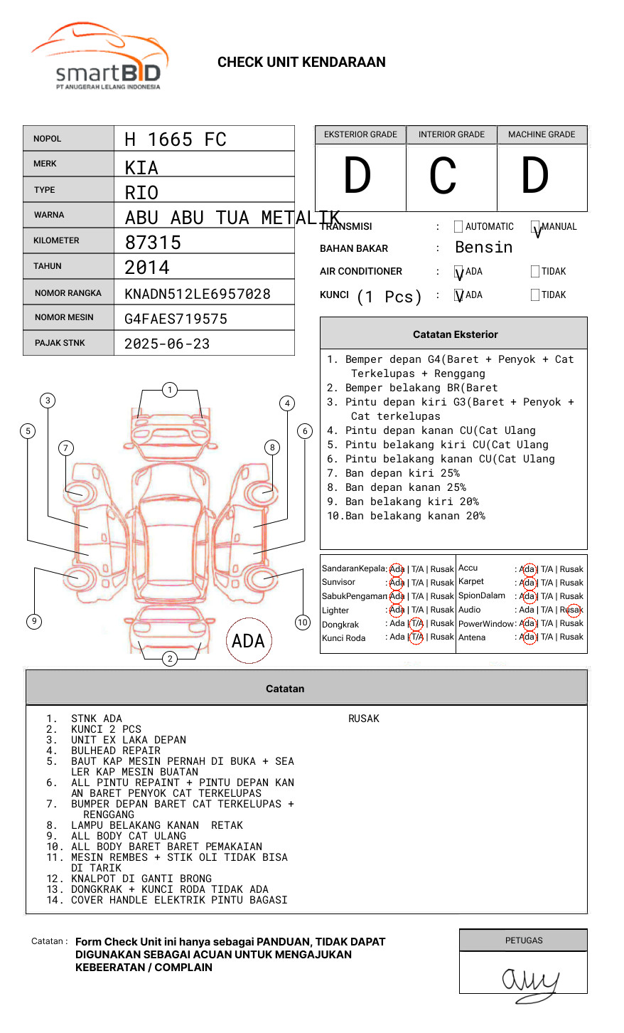 SEBELUM MELAKUKAN PENAWARAN UNIT PESERTA LELANG WAJIB MELAKUKAN PENGECEKAN UNIT DAN DOKUMEN TERLEBIH DAHULU // PIC ARDIAZ 082142028080 // UNIT DIKENAKAN BIAYA PPN 1.1% DARI HARGA TERBENTUK //