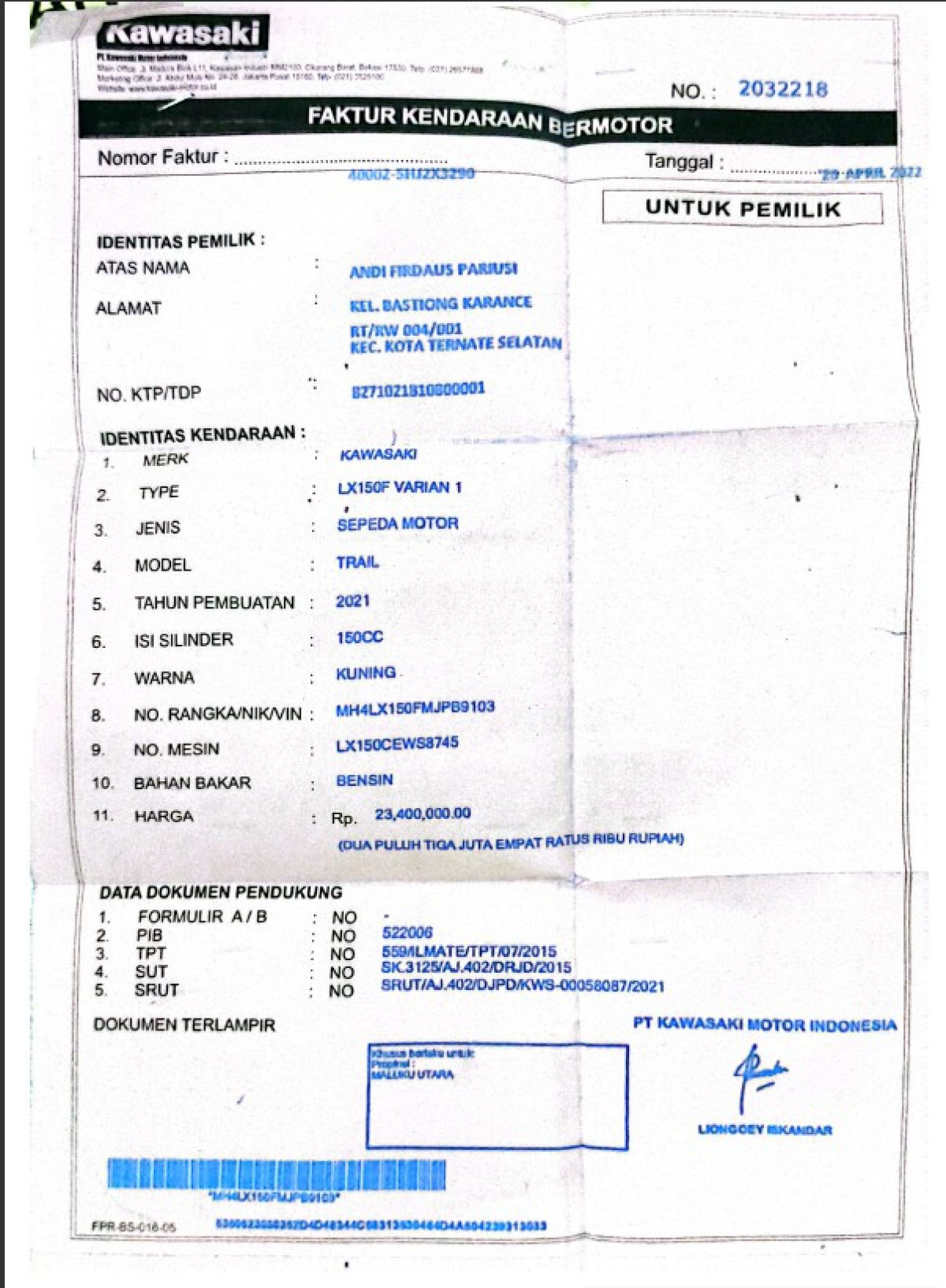 | No. Rangka | : | MH4LX150FMJPB9103 |