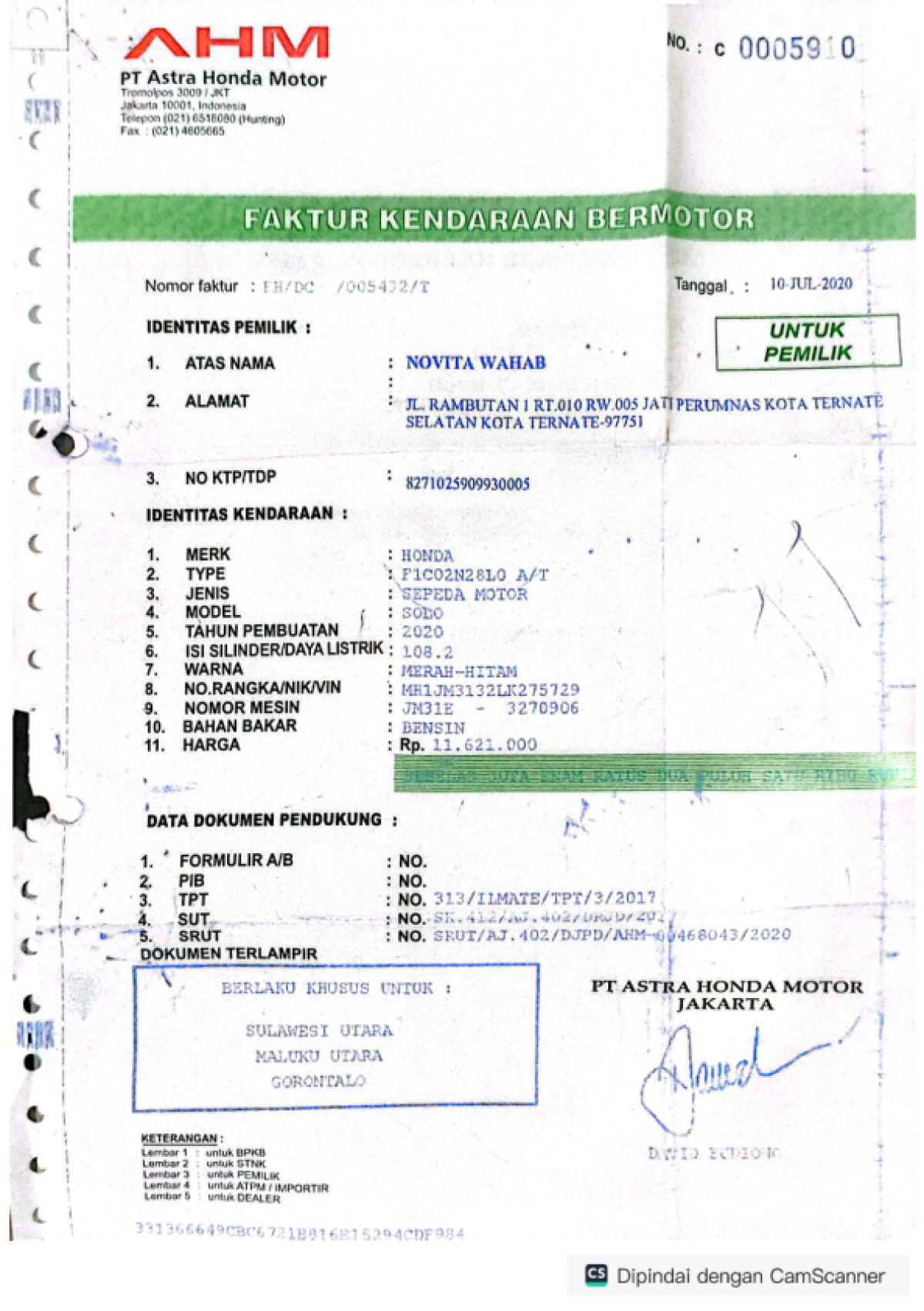 | No. Rangka | : | MH1JM3132LK275729 |